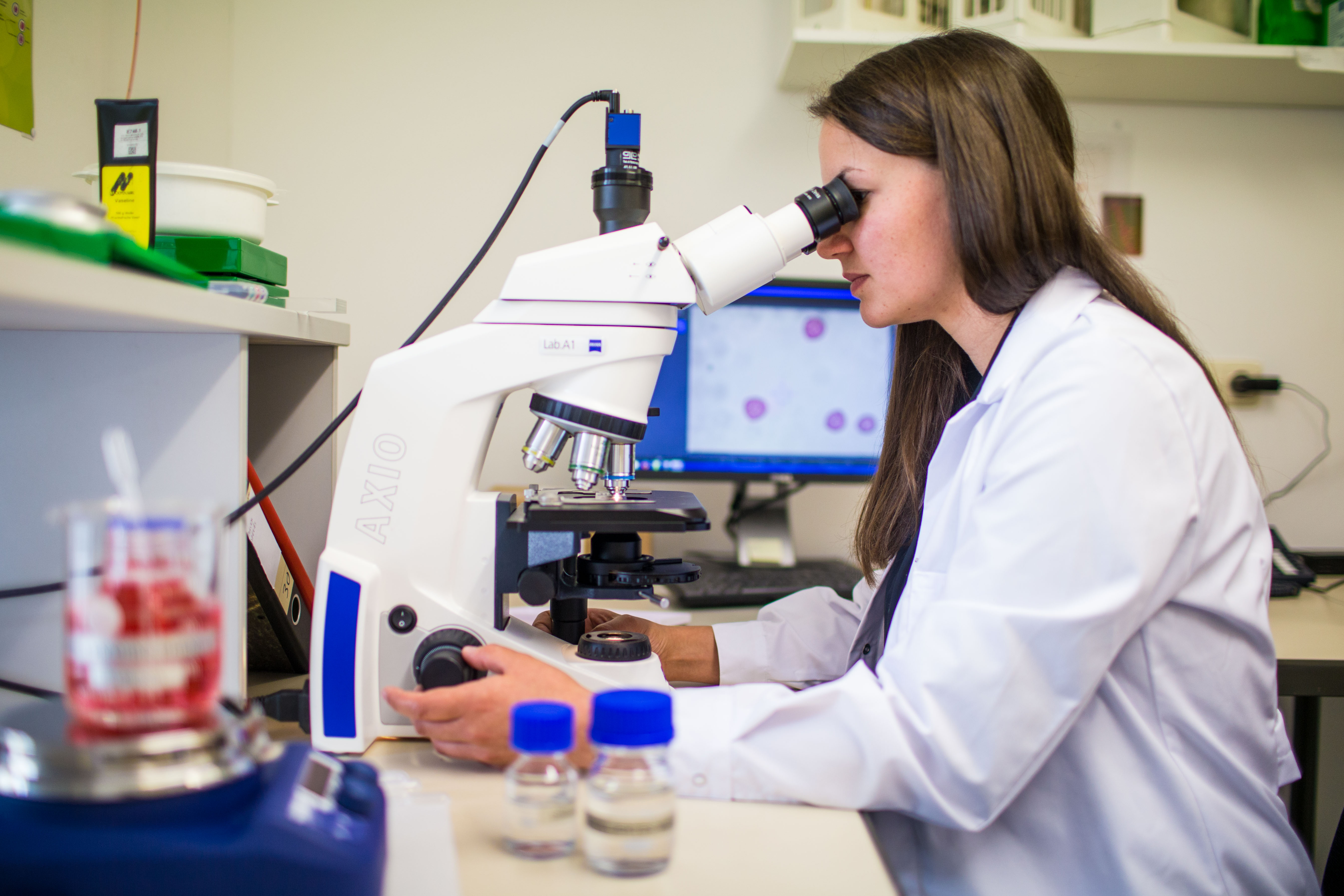 Die Studentin Johanna Jetschni untersucht im Labor des Fachbereichs Geographie der Katholischen Universität Eichstätt-Ingolstadt für ein Forschungsprojekt Blütenpollen mit einem Mirkoskop. Die Pollen werden mit einer speziellen Pollenfalle auf dem Campus in Eichstätt gesammelt.