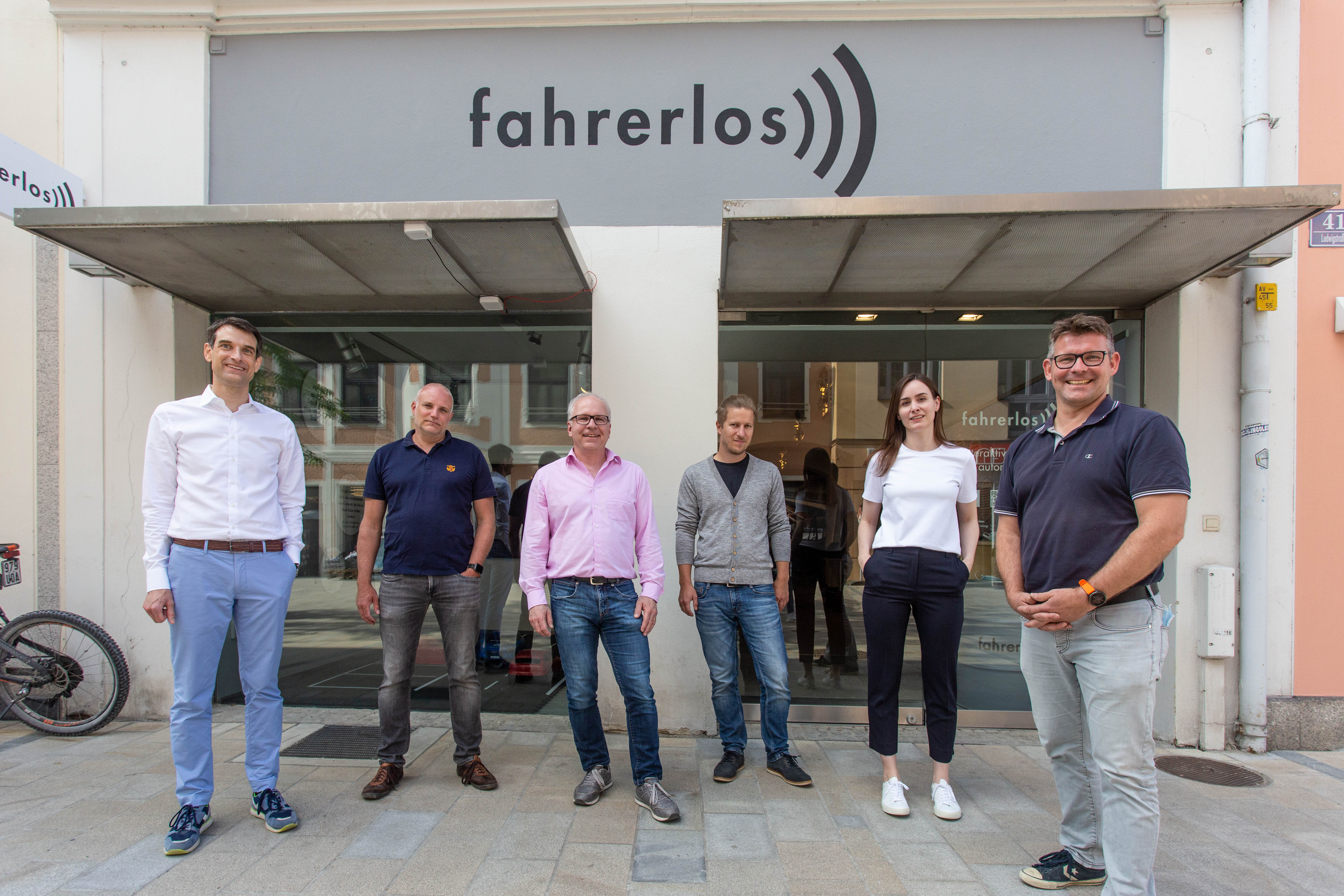 v.l.) Prof. Dr. Jens Hogreve (KU), Stefan Holz (EFS), Wolfram Remlinger (Audi AG), Jörg Sichermann (EFS), Frederica Janotta (KU) und Lutz Morich (Audi AG) laden die Bevölkerung ins „fahrerlos“ ein, um in einen Dialog zu automatisierter Mobilität zu kommen.