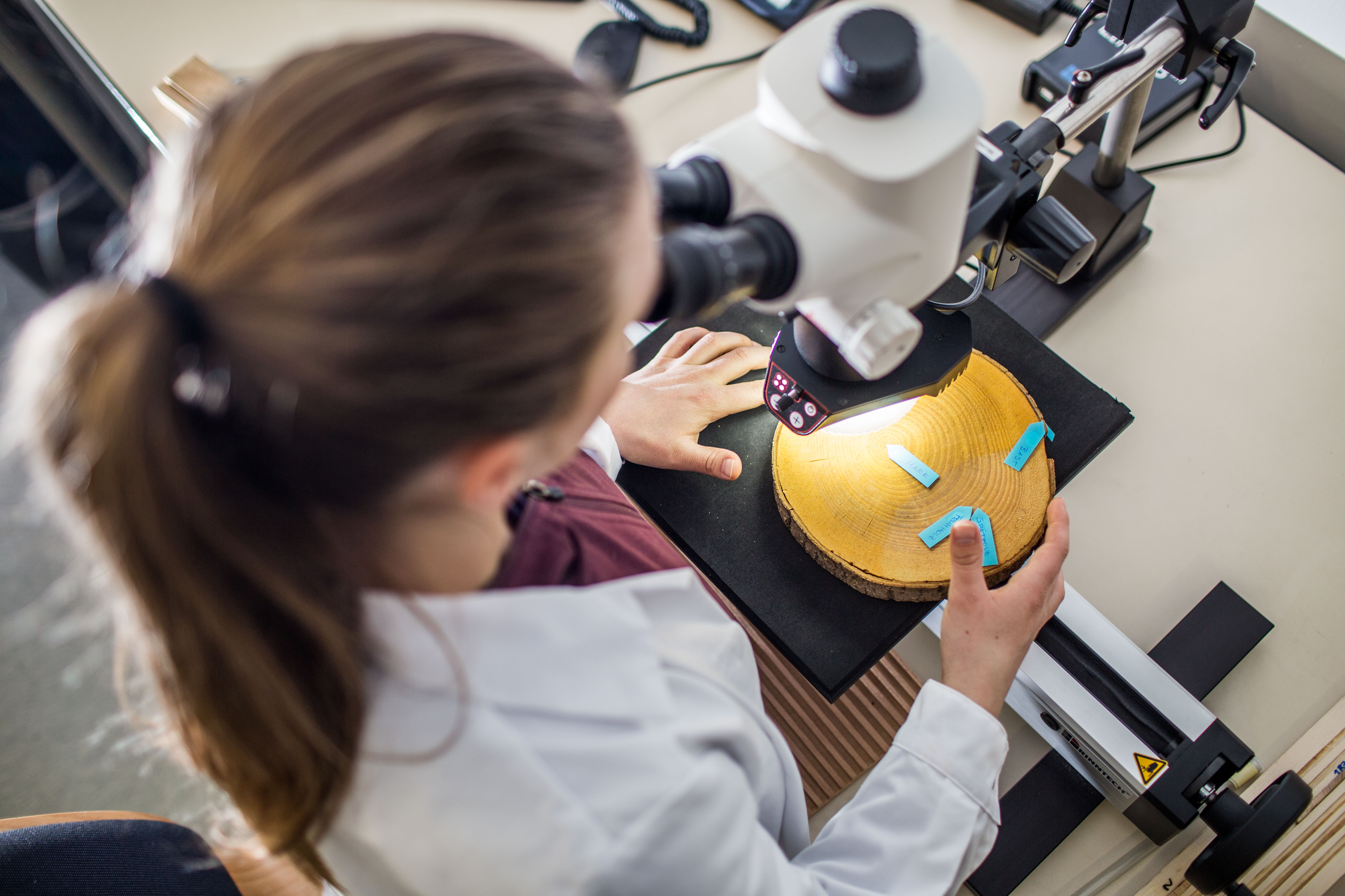 Die Studentin Sara Hocheder untersucht im Labor des Fachbereichs Geographie der Katholischen Universität Eichstätt-Ingolstadt die Jahresringe einer Baumscheibe mit dem Mikroskop.