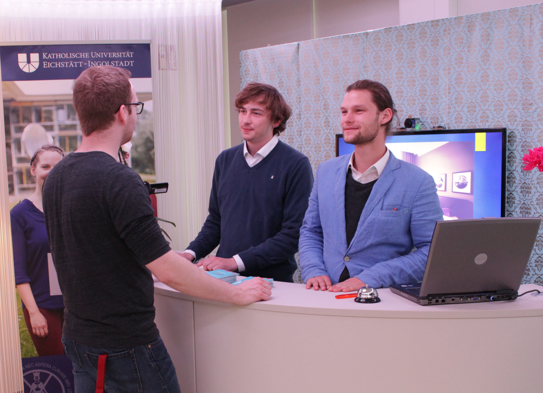 Tourismus-Studierende der KU führen auf unterschiedliche Weise Gespräche mit fiktiven Hotelgästen und verhalten sich dabei gezielt gastfreundlich oder wortkarg, effizient oder unstrukturiert. (Foto: Fraunhofer SCS)