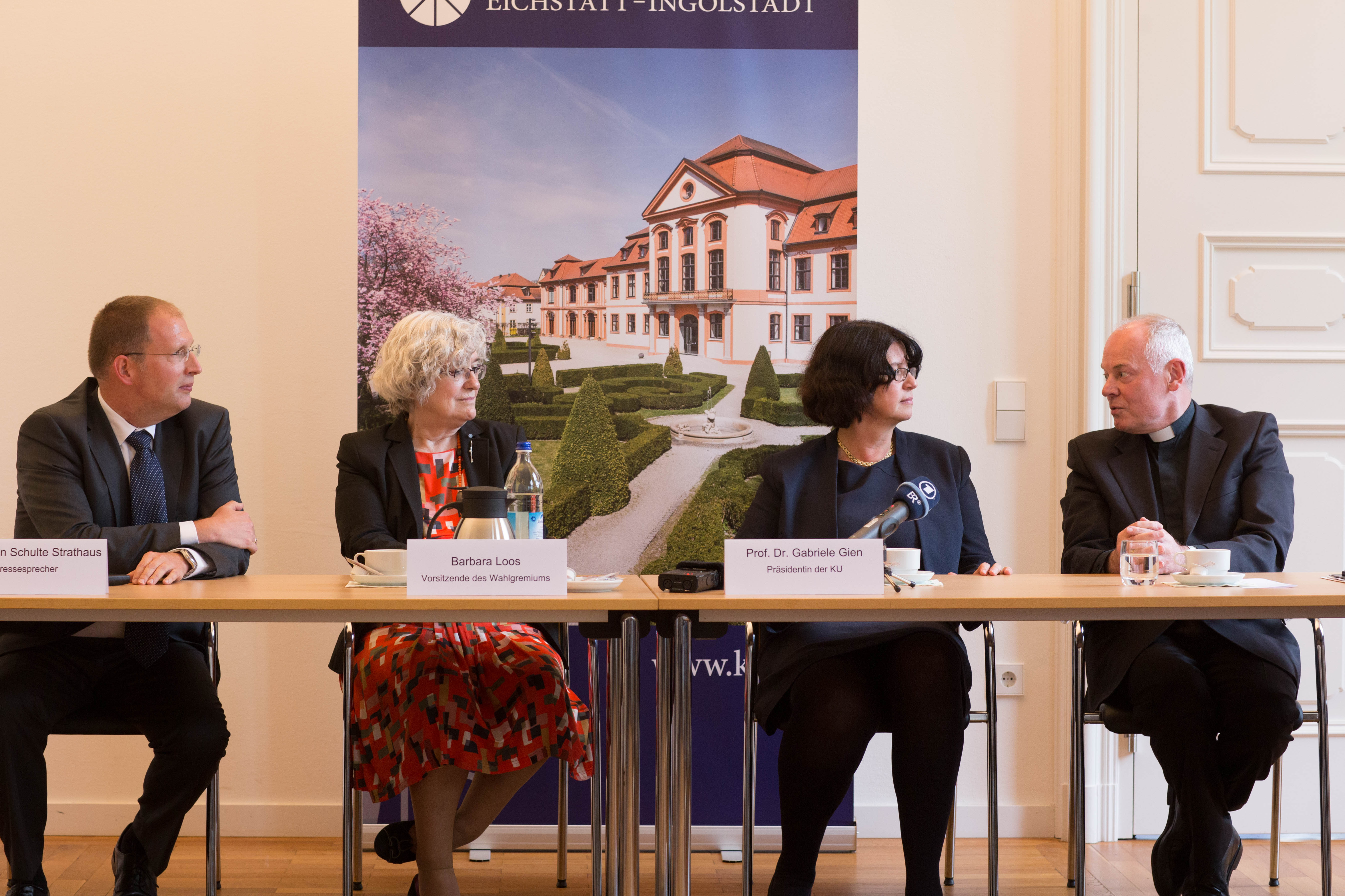 Präsidentenwahl an der Katholischen Universität Eichstätt-Ingolstadt: Das Wahlgremium hat am 15. Juni 2016 Prof. Dr. Gabriele Gien zur Präsidentin gewählt. In einem Pressegespräch stellen sich Gien, die Vorsitzende des Wahlgremiums, Barbara Loos, sowie der Vorsitzende des Stiftungsrats der KU, Weihbischof Dr. Dr. Anton Losinger, den Fragen der Journalisten.