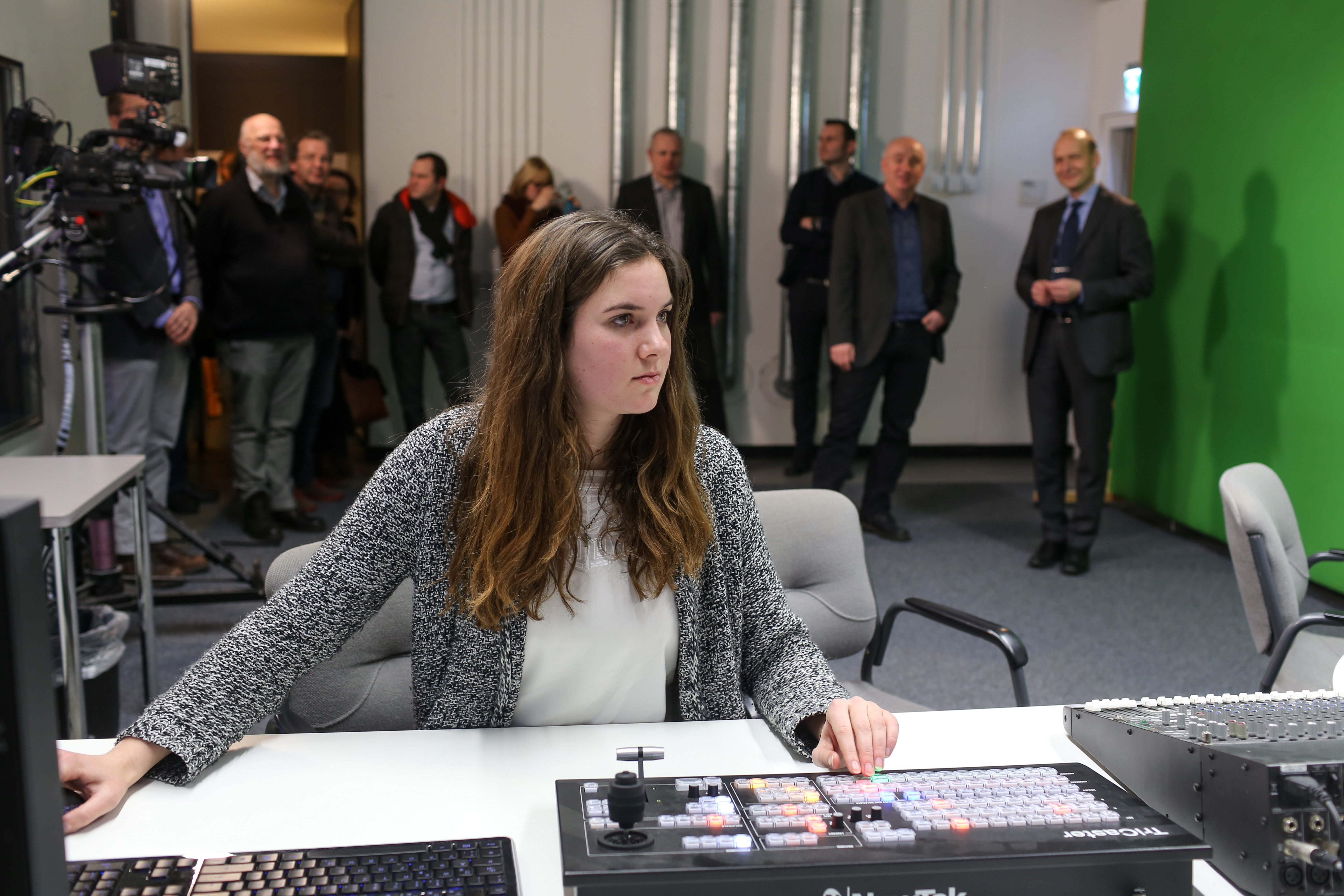 Eröffnung des technisch neu ausgestatteten Medienhauses des Eichstätter Journalistikstudienganges Im Hintergrund rechts: Kanzler Kleinert lässt sich Technik erklären
