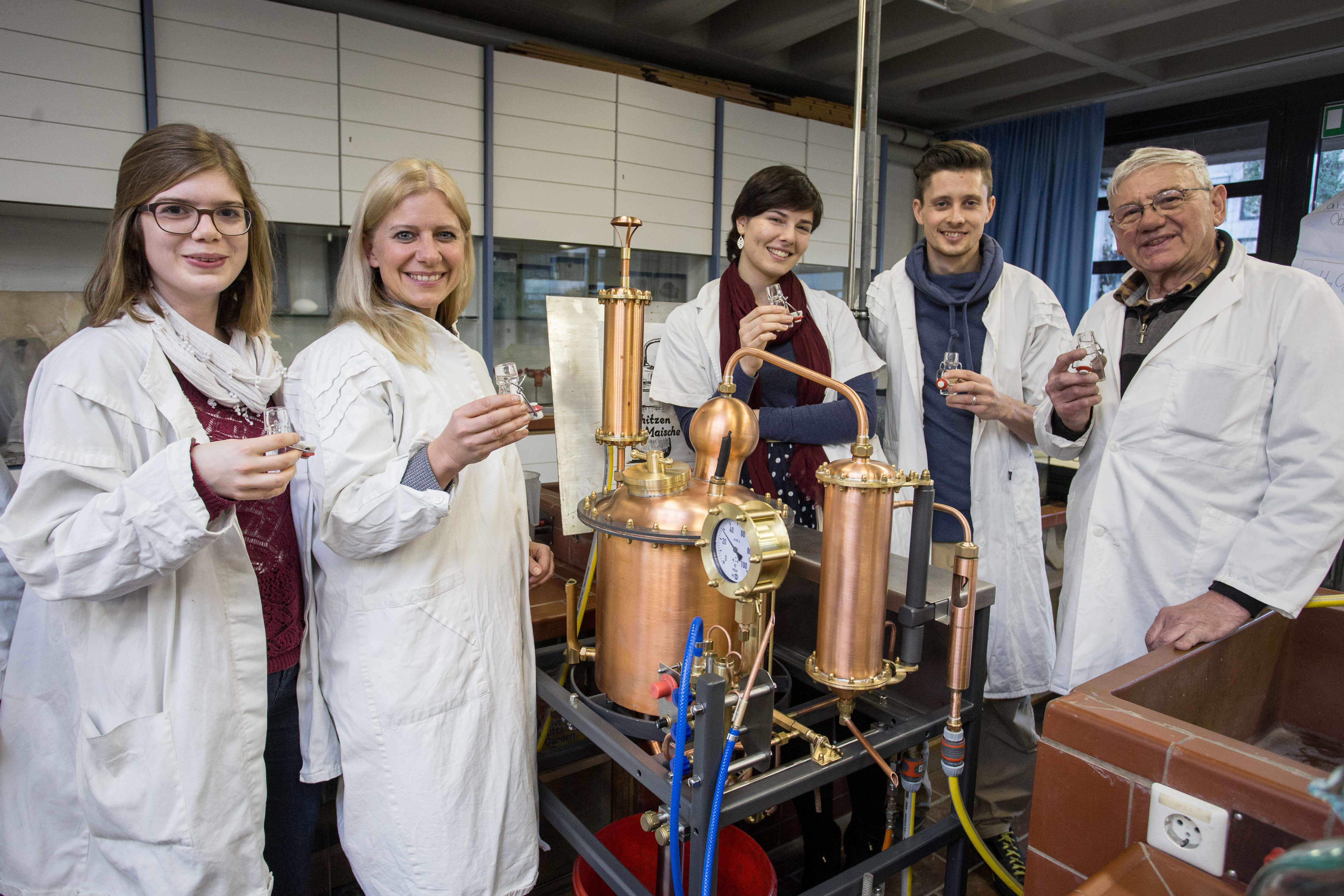 Im Rahmen einer Lehrverstaltung des Faches Didaktik der Biologie nimmt die Katholische Universität Eichstätt-Ingolstadt am 16. Februar 2017 eine Schnapsdestillerie in Betrieb. Studierende erfahren in dem Seminar, wie aus den Zwetschgen des unieigenen Kapuzinergartens ein 40-prozentiger Schnaps entsteht. Für das Obstbrennen hat das Zollamt der KU eine Genehmigung erteilt. Im Bild Studierende mit der Biologie-Dozentin Dr. Helga Rolletschek (zweite/dritte von links) und dem Eichstätter Metallbauer...    »