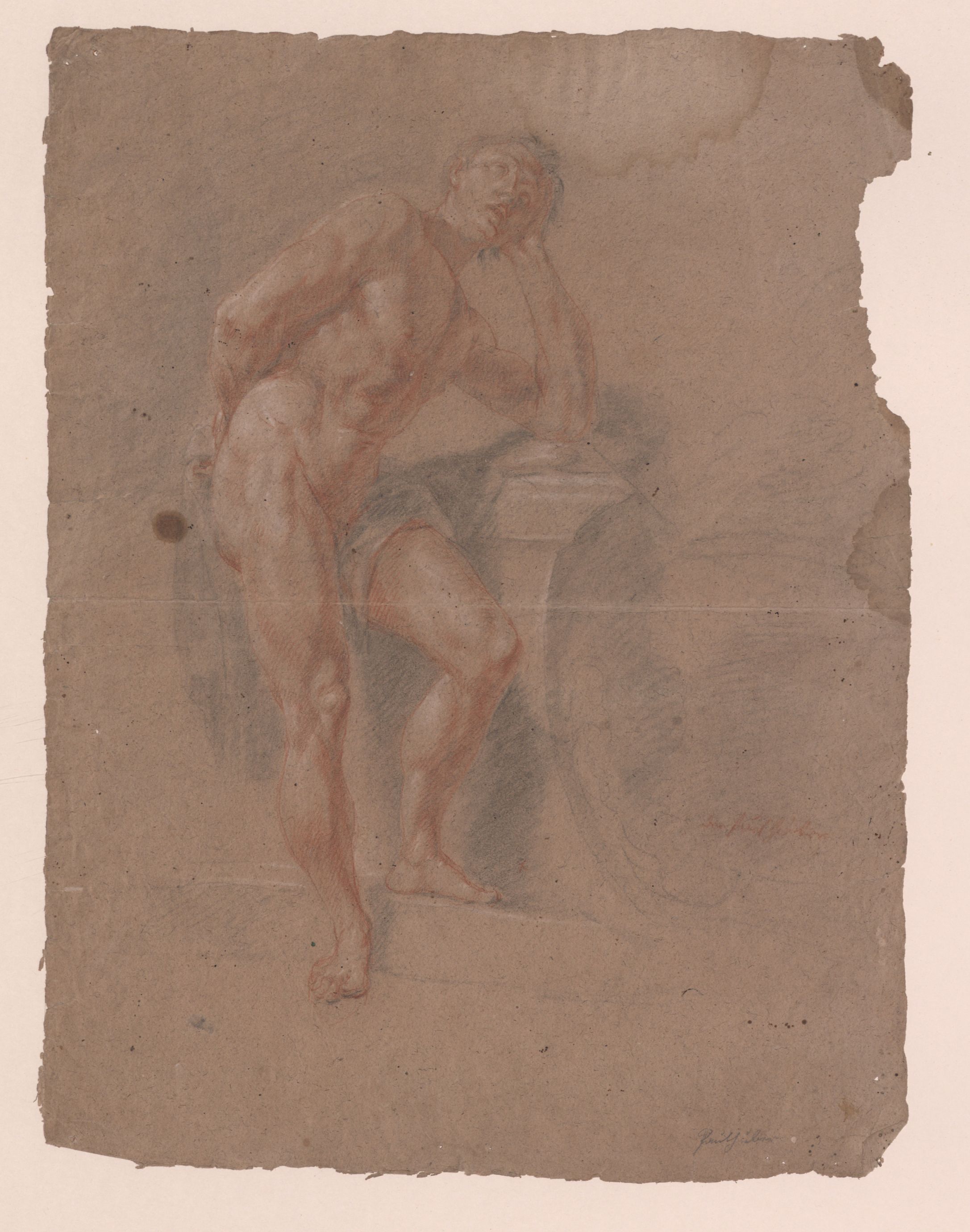 Rötel, Bleistift und weißer Stift; ca. 46,5 x 35 cm (Blatt). - Unten rechts von späterer Hand: "Paulhuber". - Größere Fehlstelle oben rechts, Einrisse und Flecken. - In der Mitte waagrecht gefalzt. - MIT DIGITALAUFNAHME