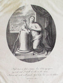 [Frau mit Kreuz vor Säulenstumpf mit angelehntem Ruder, im Fenster Bild des Meeres mit Segelboot in Seenot]