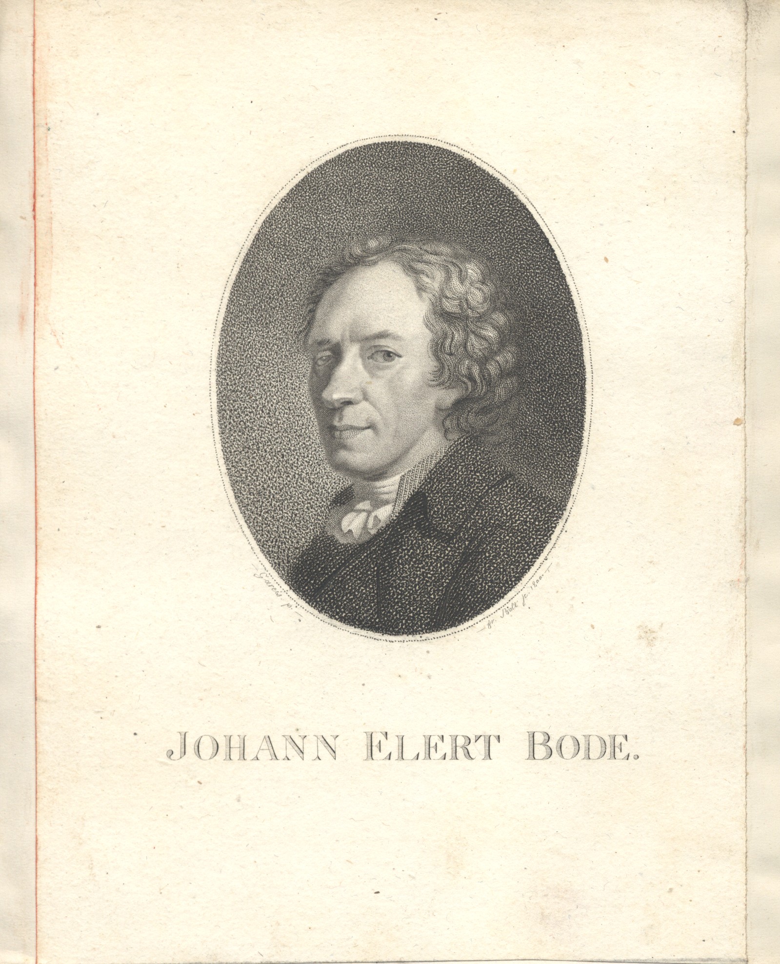 Frontispiz zu: Bode, Johann Elert: Anleitung zur Kenntniß des gestirnten Himmel. - Siebende verbesserte Auflage. - Berlin : Christian Friedrich Himburg, 1801. - Vgl.: Katalog der graphischen Porträts in der Herzog August Bibliothek Wolfenbüttel 1500-1850, Reihe A: Die Porträtsammlung, Nr. A 1733. - S.a.: Allgemeiner Porträt-Katalog / hrsg. von Hans Dietrich von Diepenbroick-Grüter, S. 75, Nr. 2439. - Singer, Hans Wolfgang: Allgemeiner Bildniskatalog, Nr. 8176 und 8181