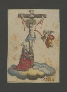 [Christus am Kreuz, zu seinen Füßen Maria, rechts ein fliegender Engel, der das Blut Christi in einem Gefäß auffängt]