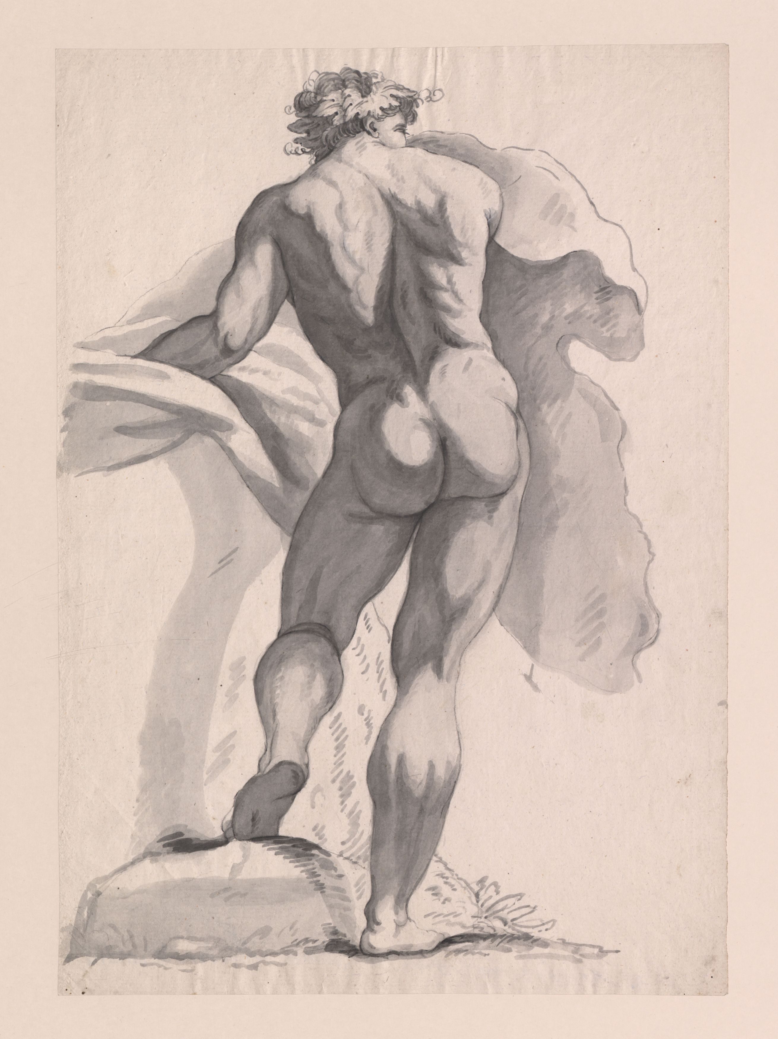 Pinsel in grau, teilweise über Bleistift, grau laviert; 45 x 31,9 cm (Blatt). - In der Mitte horizontal gefalzt, einige weitere Falten und Flecken. - MIT DIGITALAUFNAHME
