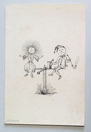 [Sonne und Mond, als Frau und Mann dargestellt, auf einem Drehkreuz sitzend]