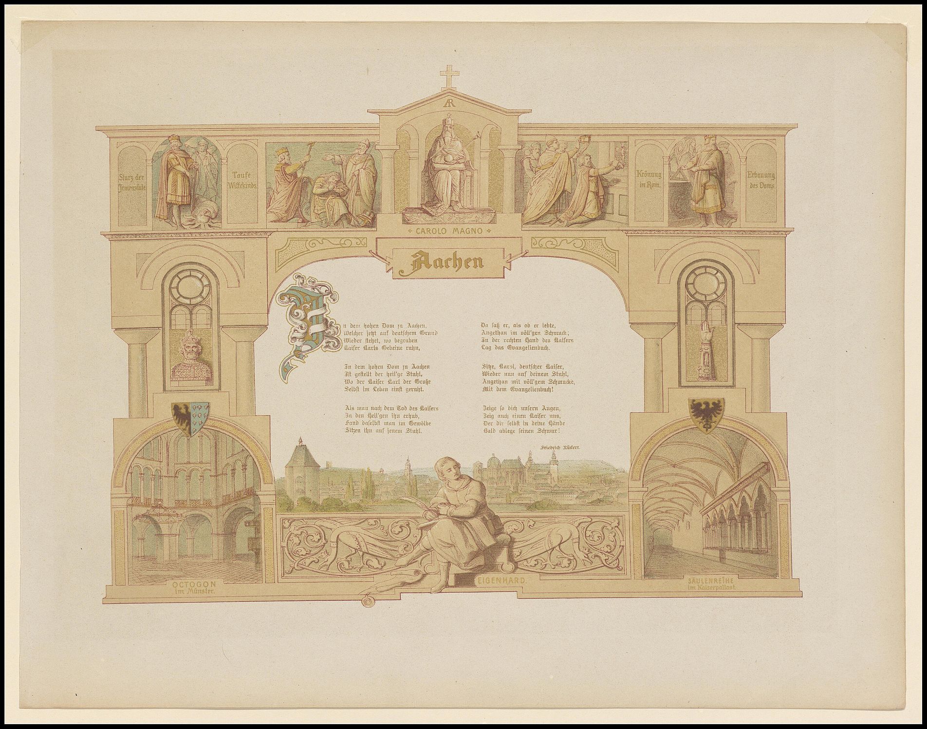 [Gesamtansicht in Architektur, in dieser Szenen aus dem Leben Karls des Großen, Ansichten "Octogon im Münster" und "Säulenreihe im Kaiserpallast" sowie mittig ein Gedicht von Friedrich Rückert]