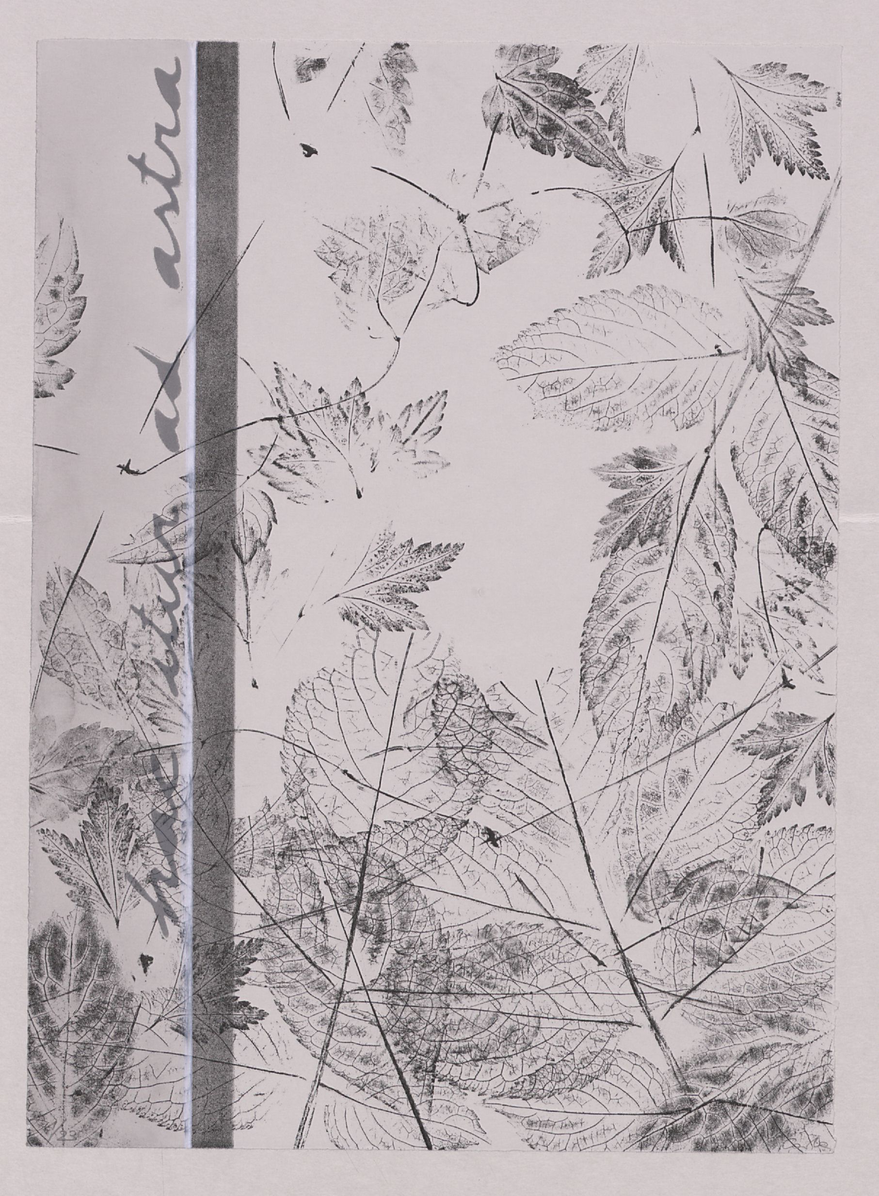 [Jahresdruck 2011 der Lithographie-Werkstatt Eichstätt: Abdruck von Blättern, gesammelt im ehemaligen Cobenzl-Garten in Eichstätt, kombiniert mit einer Bildunterschrift aus dem Altarraum der ehemaligen Klosterkirche Notre Dame in Eichstätt:] hac itur ad astra