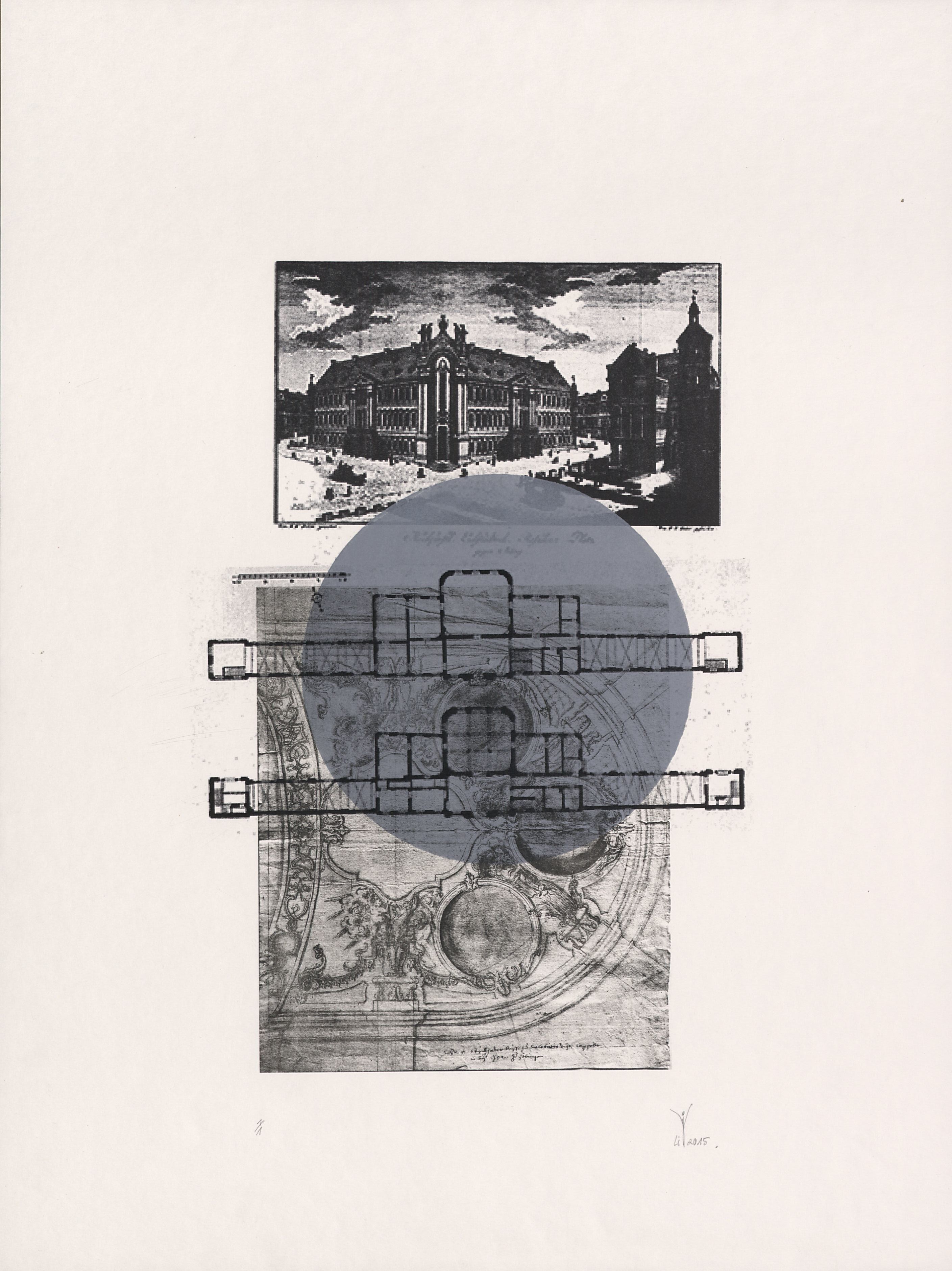 Lithographie (computerbearbeitete Ansicht und Grundrisse, Seifenfeld, Umdruck des Entwurfs); ca. 40,5 x 28 cm (Bild) bzw. 63,8 x 48 cm (Blatt). - Von der Künstlerin mit Bleistift datiert, numeriert (1/1) und signiert. - Auf der Rückseite alte, ungültige Bezeichnung mit Bleistift. - MIT DIGITALAUFNAHME