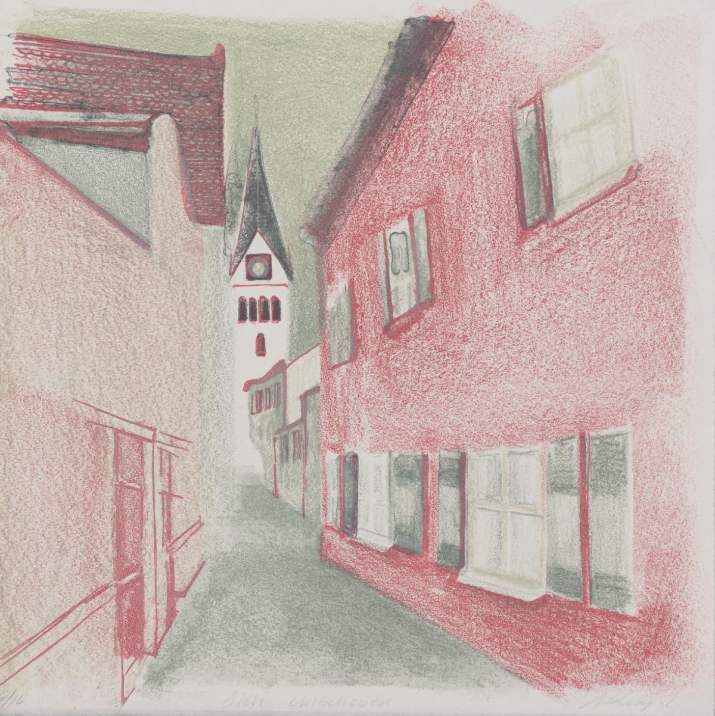 Lithographie (Kreide, Tusche; 6 Farben); 25,3 x 25 cm (Blatt). - Von der Künstlerin mit Bleistift bezeichnet, numeriert (6/14) und signiert. - Verlagsangabe als Prägedruck. - MIT DIGITALAUFNAHME