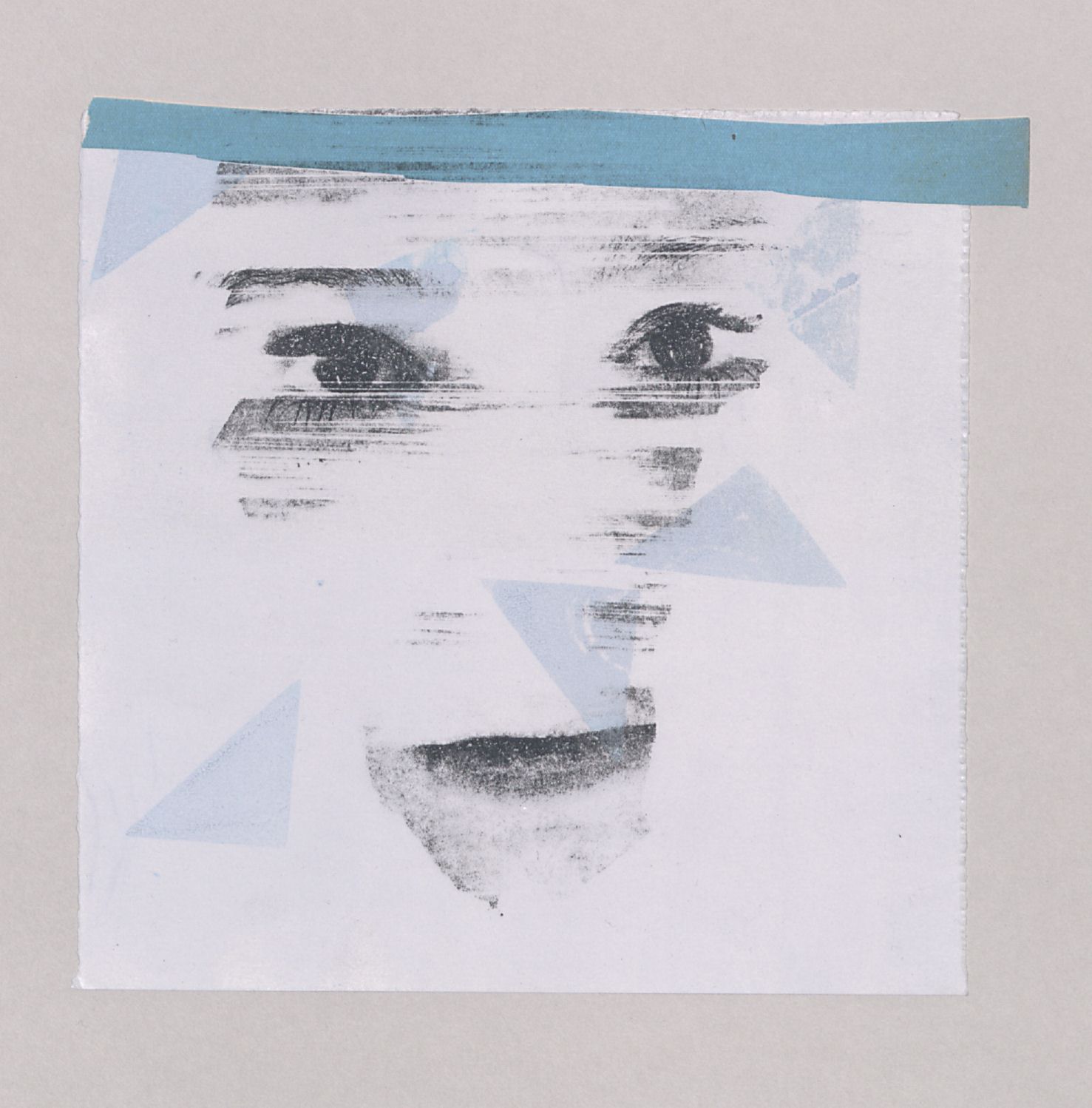[Teil eines Gesichts, zusammen mit vorwiegend mehreren Dreiecken und einem Papierstreifen]