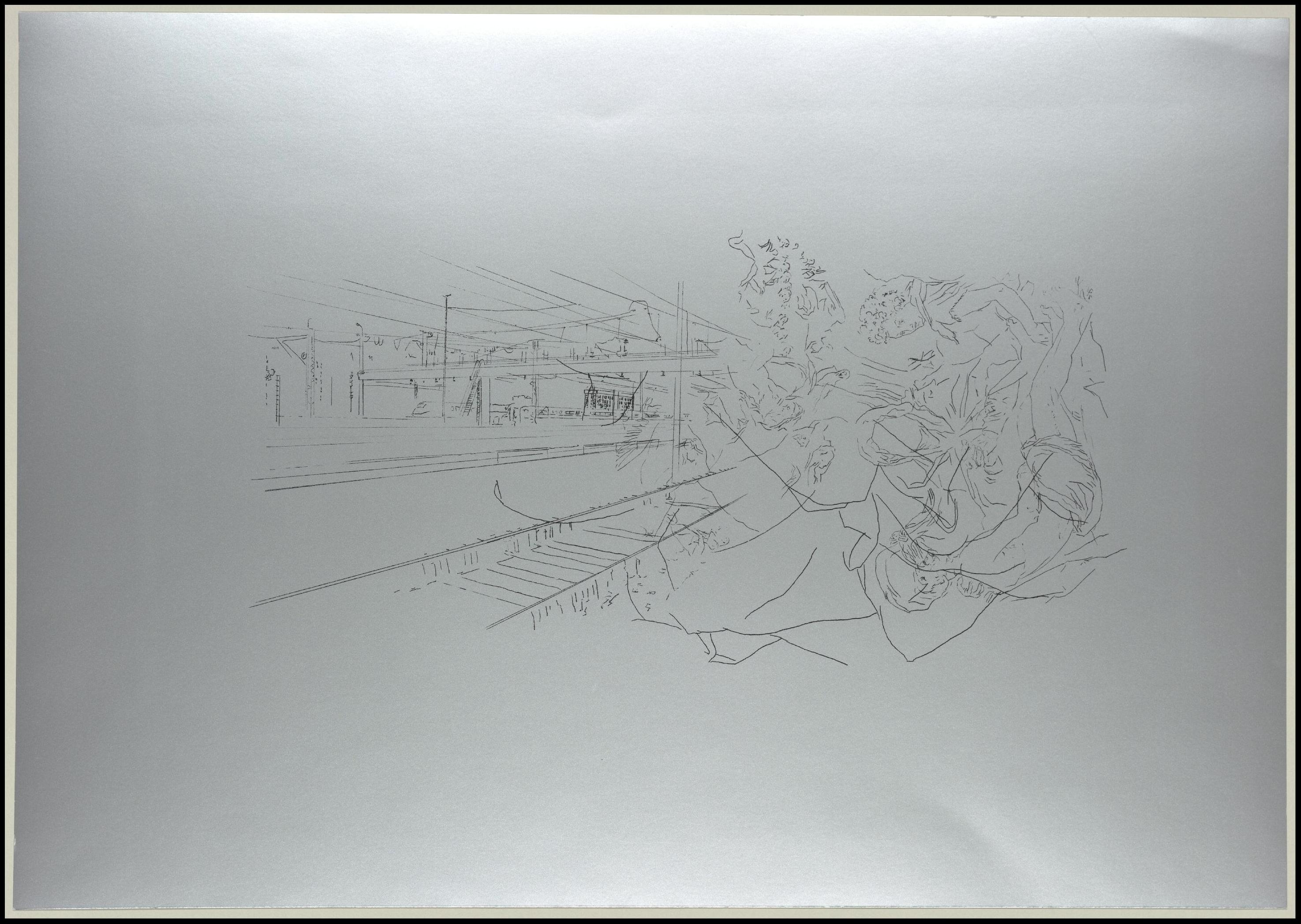 Lithographie (Zeichnung durch Blaupapier) auf silbernem Glanzpapier; ca. 17 x 34,5 cm (Bild) bzw. 35,1 x 49,9 cm (Blatt). - Von der Künstlerin auf der Rückseite bezeichnet, datiert, numeriert (4/4 auf Metallic) und signiert. - MIT DIGITALAUFNAHME