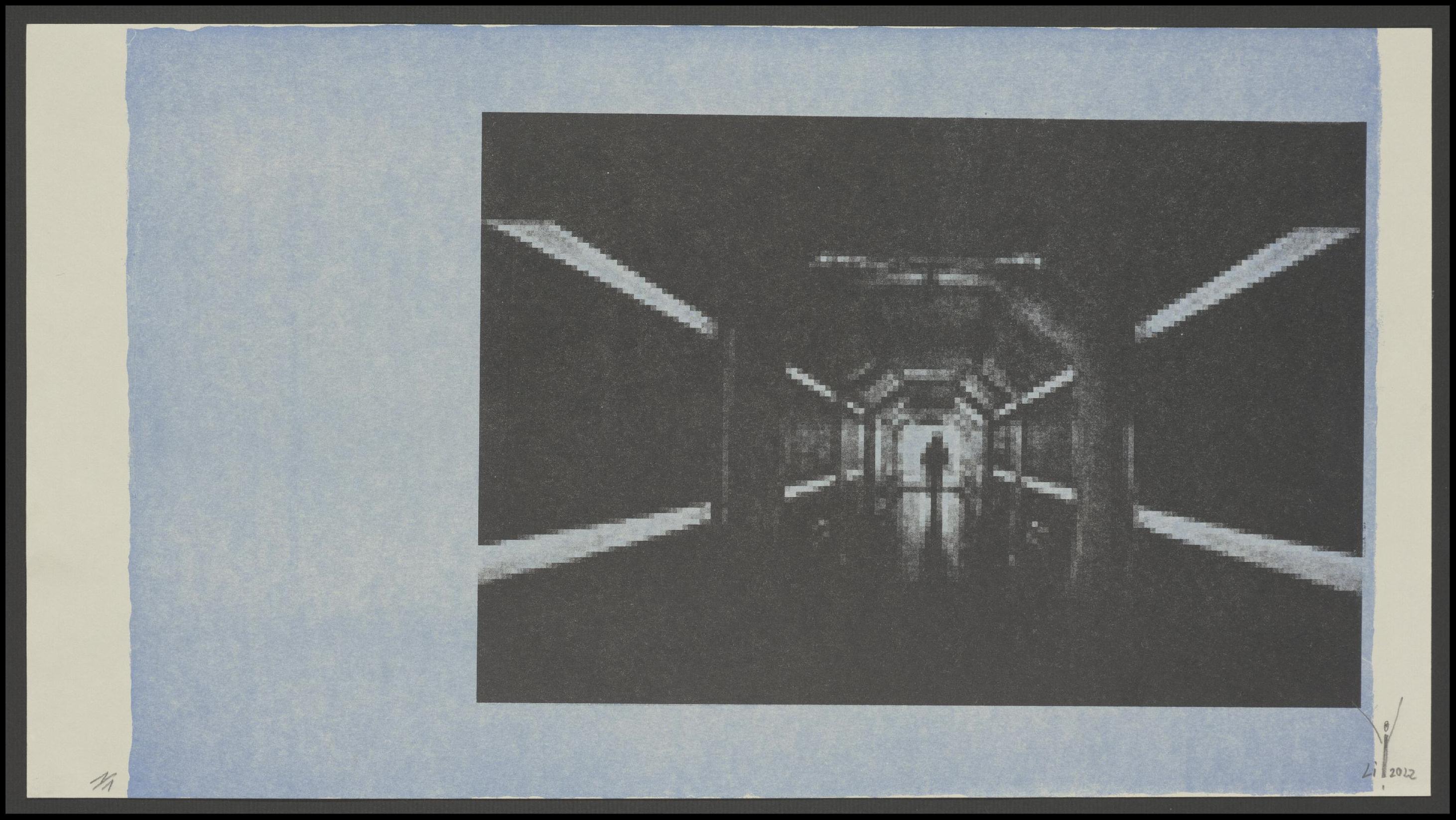 Lithographie (2 Passagen: Umdruck eines gepixelten Fotos, Farbfeld); 19,9 x 30 cm (Bild, ohne Farbfeld) bzw. 26,1 x 47,6 cm (Blatt). - Von der Künstlerin mit Bleistift auf der Rückseite bezeichnet, auf der Vorderseite datiert, numeriert (1/1) und signiert. - MIT DIGITALAUFNAHME
