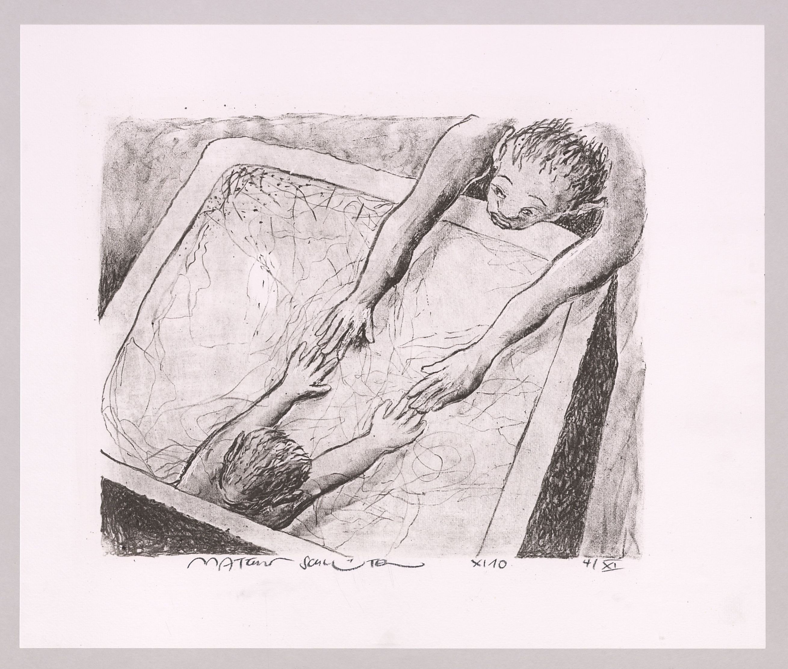 [Jahresdruck 2010 der Lithographie-Werkstatt Eichstätt: Zwei sich über einen Lithographiestein beugende Menschen, die sich mit den Fingerspitzen berühren]