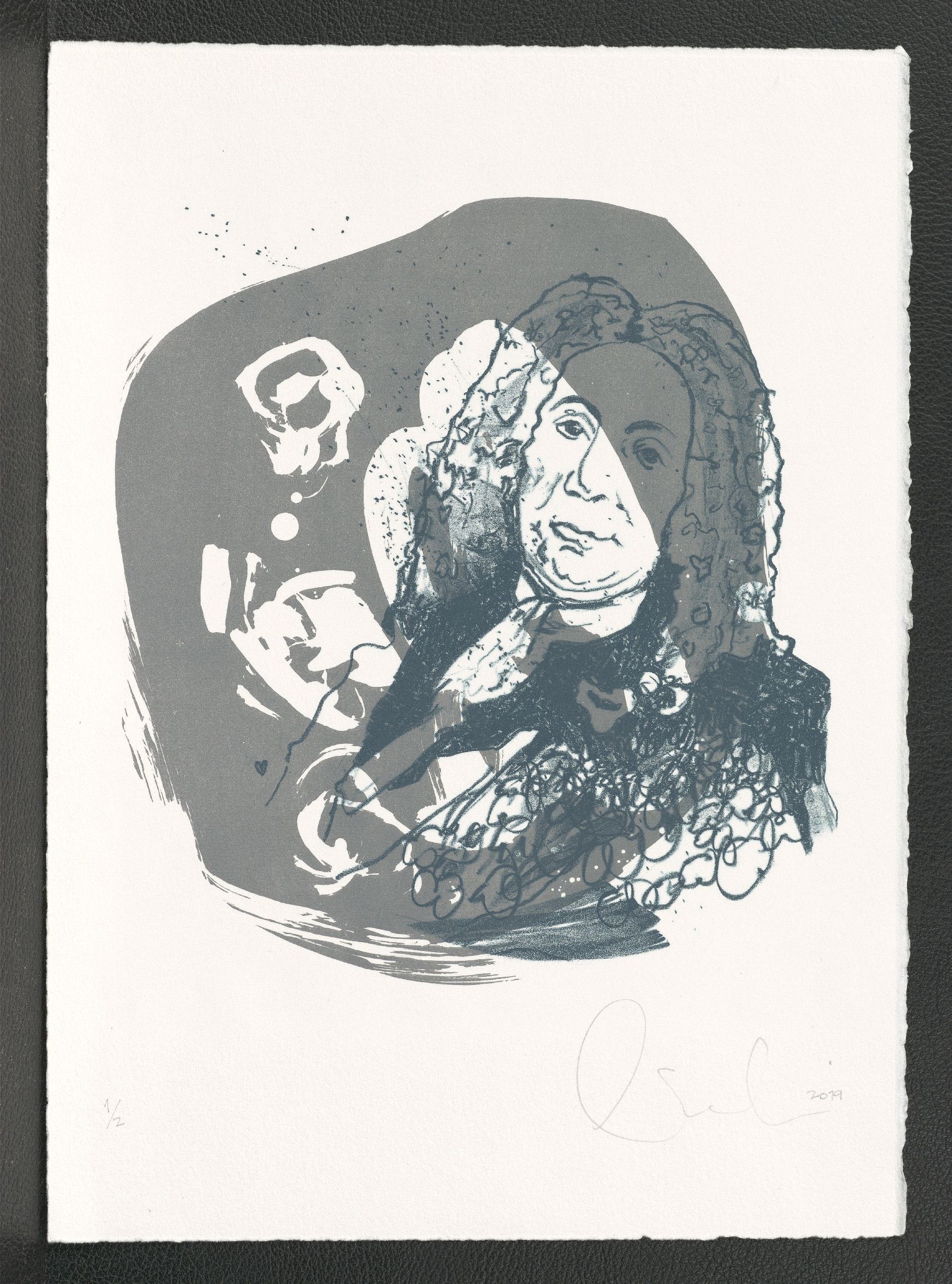 Lithographie, zweifarbig; ca. 24,7 x 22,7 cm (Bild) bzw. 37,5 x 27 cm (Blatt). - Von der Künstlerin mit Bleistift datiert, numeriert (1/2) und signiert. - MIT DIGITALAUFNAHME