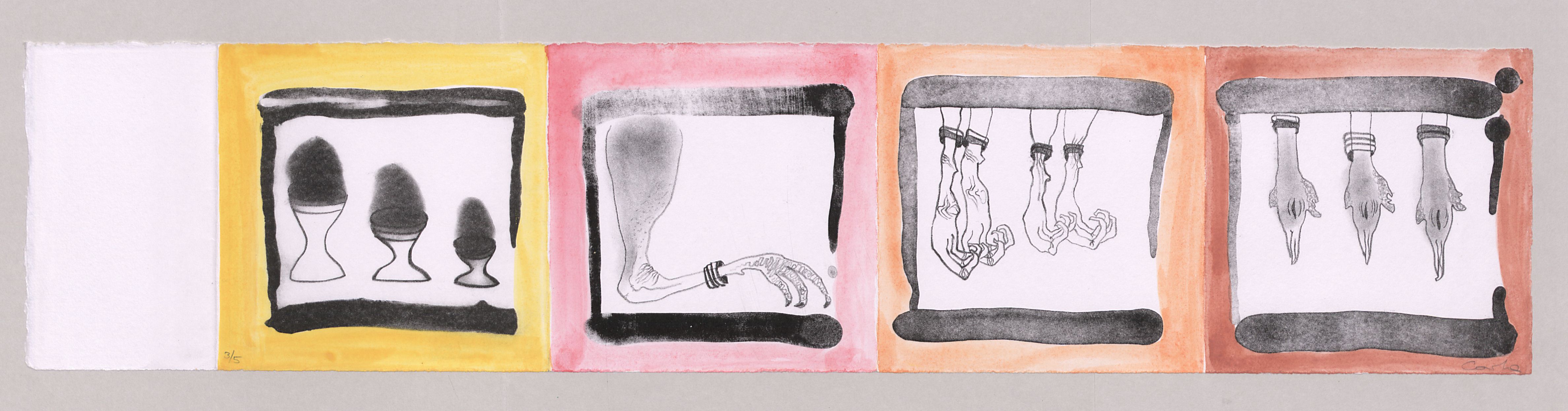 Kreidelithographie, Umrahmung in Gouache (mehrfarbig); 16,7 x 67 cm. - Gedruckt auf Büttenpapier. - Von der Künstlerin mit Bleistift numeriert (3/5) und signiert. - MIT DIGITALAUFNAHME