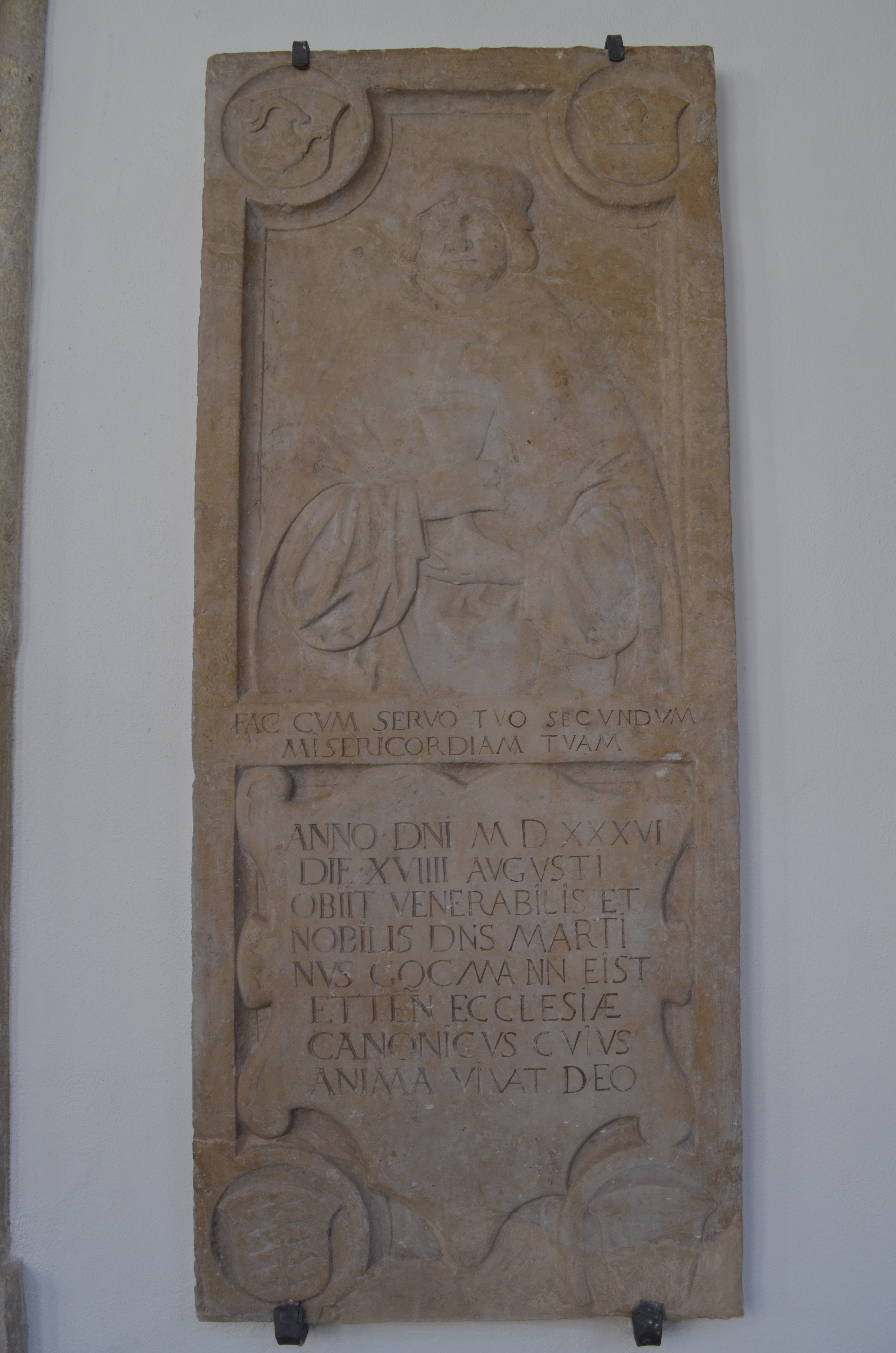 FAC CUM SERVO TUO SECUNDUM / MISERICORDIAM TUAM / ANNO DNI M.D.XXXVI / DIE XVIIII AUGUSTI / OBIIT VENERABILIS ET / NOBILIS DNS MARTI / NUS GOCMANN EIST / ETTEN ECCLESIÆ / CANONICUS CUIUS / ANIMA VIVAT DEO.