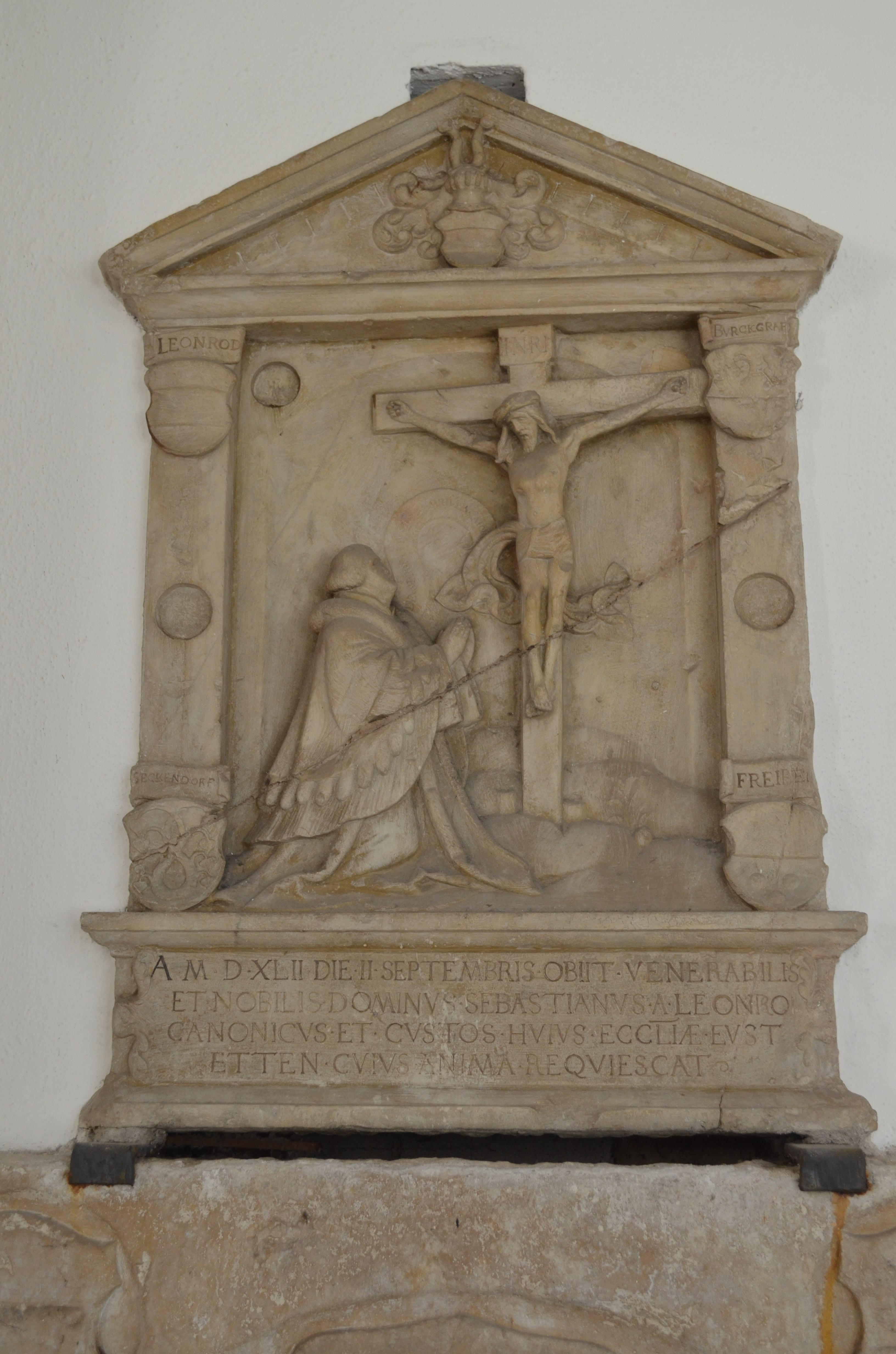 A M.D.XLII DIE II SEPTEMBRIS OBIIT VENERABILIS / ET NOBILIS DOMINUS SEBASTIANUS A LEONROD / CANONICUS ET CUSTOS HUIUS ECCLIÆ EUST- / ETTEN CUIUS ANIMA REQUIESCAT