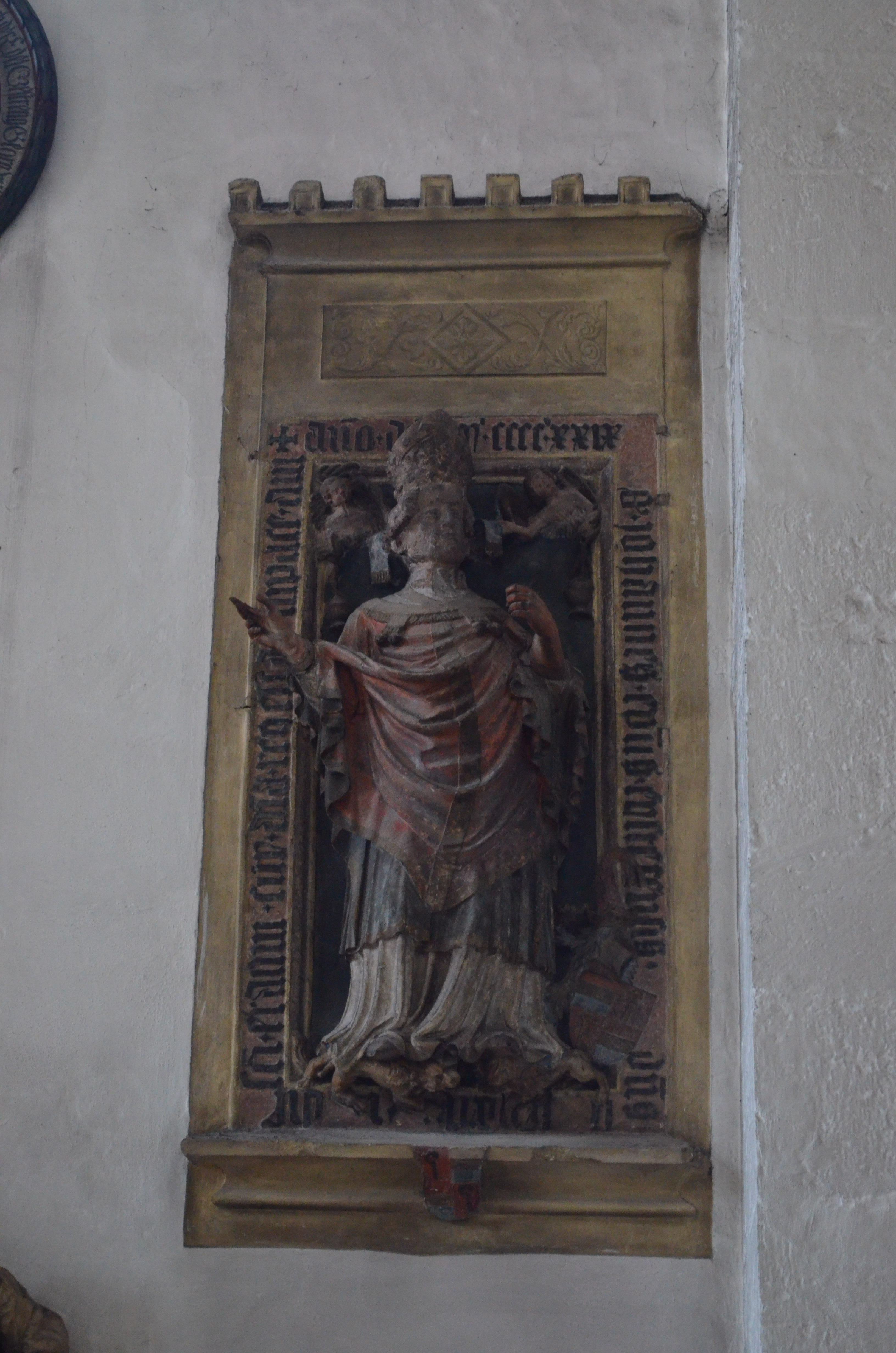 farbig gefaßte Platte in Hochrelief mit ganzfiguriger Darstellung des Bischofs; zu seinen Schultern je ein Engel, zu seinen Füßen sein Wappen; umlaufende Inschrift
