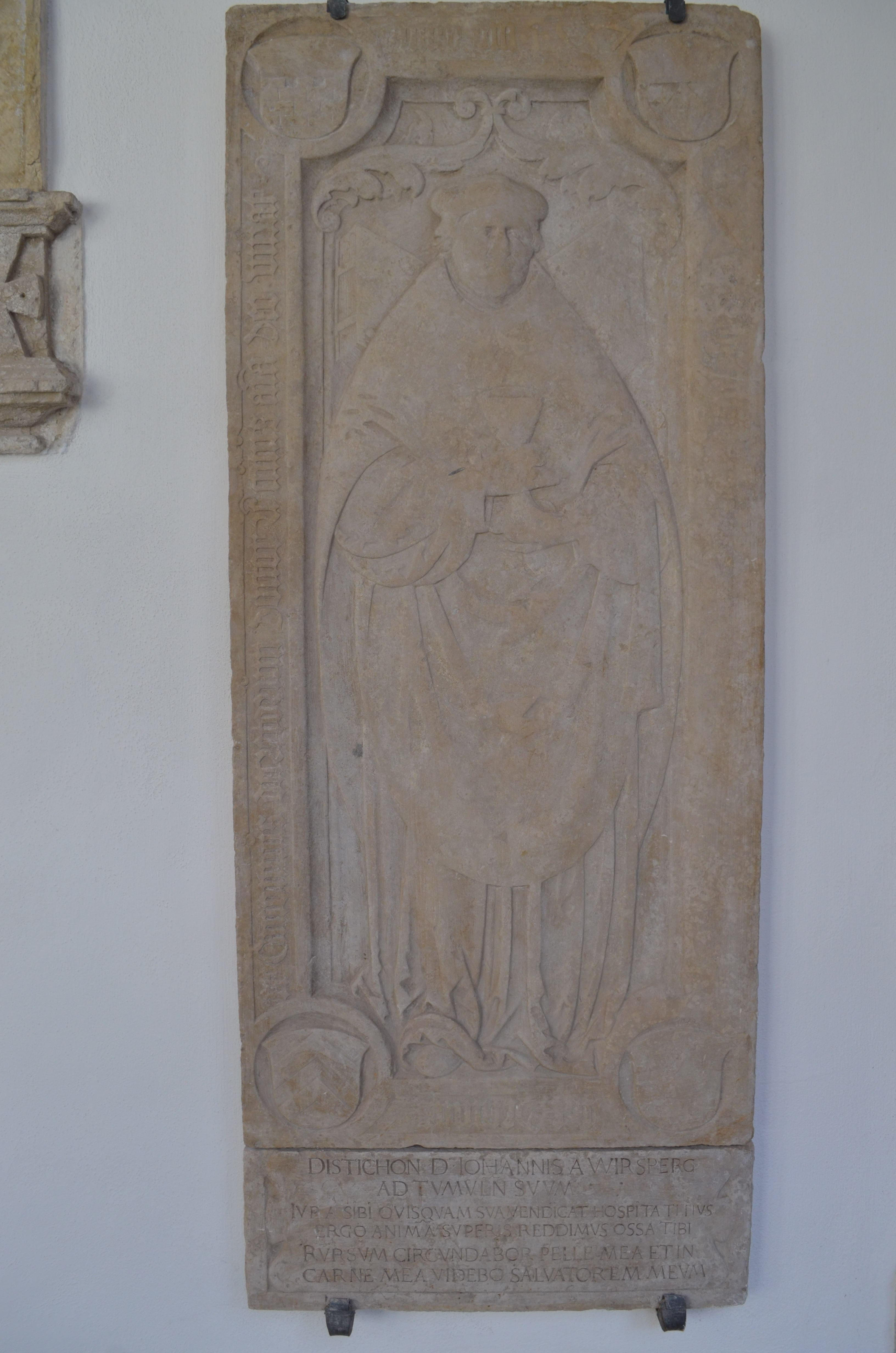 DISTICHON D. IOHANNIS A WIRSPERG / AD TUMULN SUUM / IUR A SIBI OVISQUAM SUA VENDICAT HOSPITA T...US / ERGO ANIMA SUPERIS REDDIMUS OSSA TIBI / RUPSUM CIRCUNDABOR PELLE MEA ET IN / CARNE MEA VIDEBO SALVATOREM MEUM.