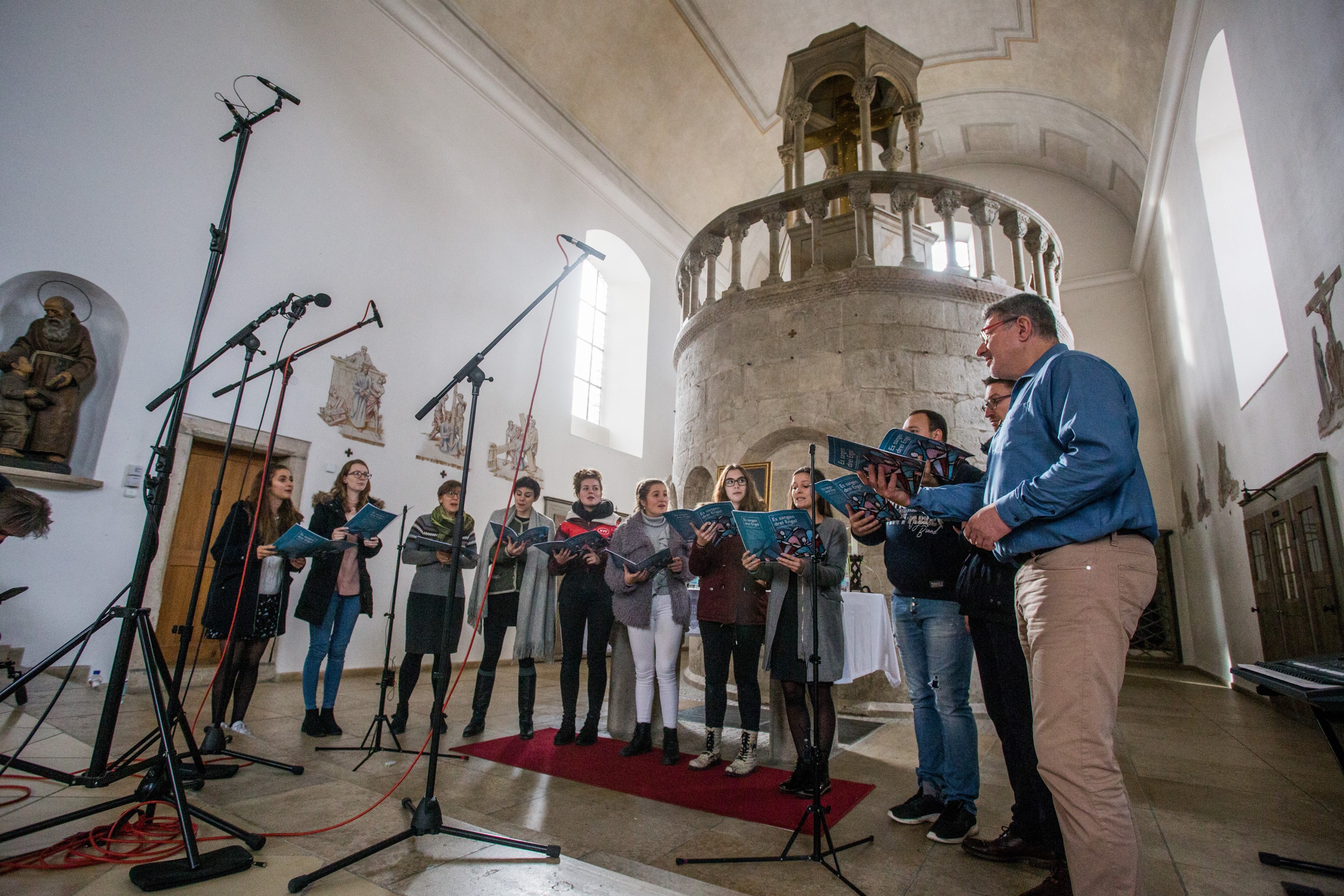 In der Eichstätter Heilig-Kreuz-Kirche haben drei Chöre der KU – hier die A-Cappella-Gruppe unter Leitung von Jörg Edelmann – eine CD mit traditionellen Weihnachtsliedern aufgenommen, die sie auch bei einem Benefiz-Konzert am 17. Dezember präsentieren werden. (Fotos: Klenk/upd)