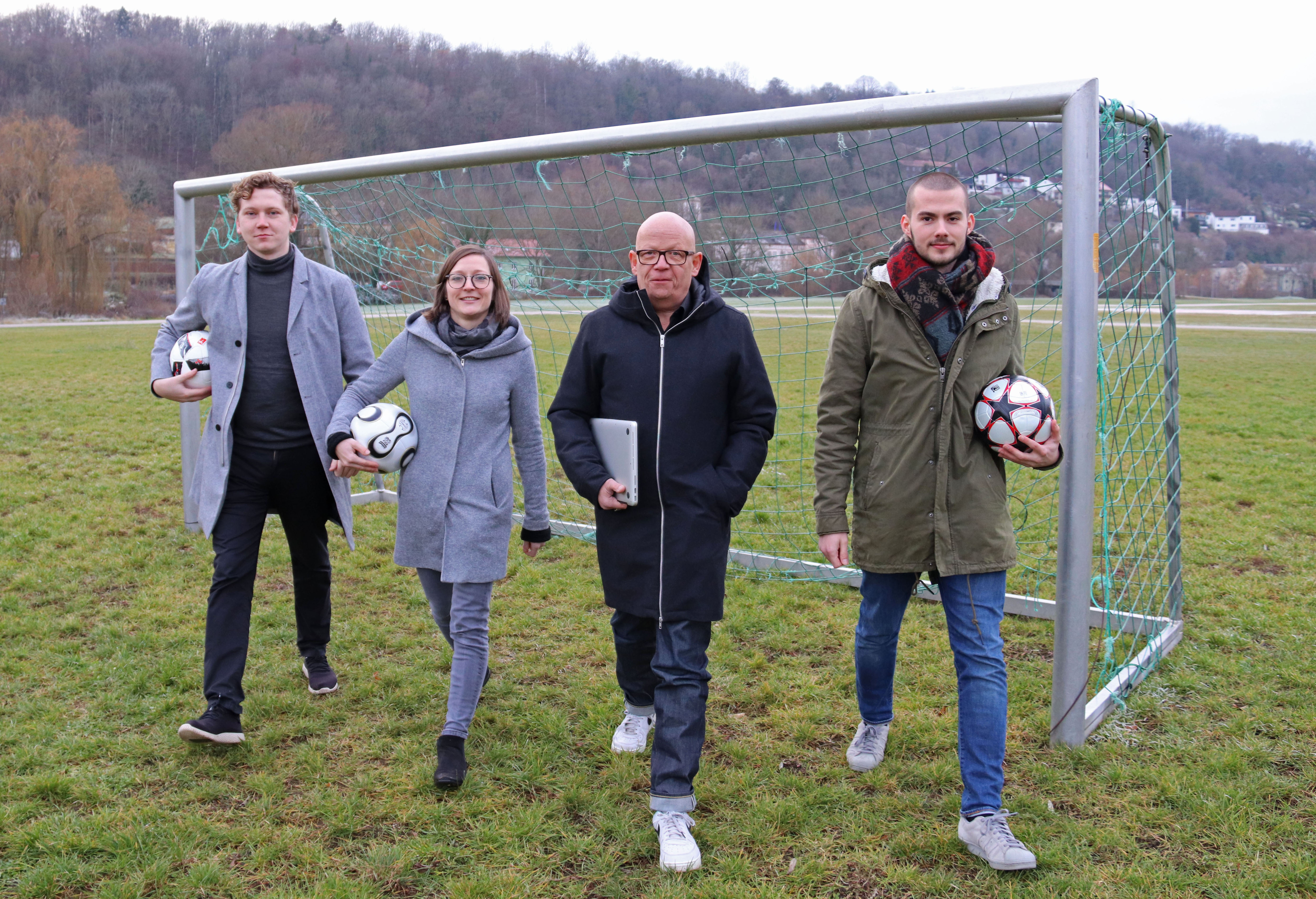 (v.r.) Moritz Brinkmann (wissenschaftliche Hilfskraft), Prof. Dr. Robert Schmidt (Professor für Prozessorientierte Soziologie an der KU) sowie Franziska Hodek und Max Weigelin (wissenschaftliche Mitarbeiter der Professur für Prozessorientierte Soziologie) untersuchen den Entste-hungsprozess von Daten zu Fußballspielen und deren Effekte auf den Profifußball. (Foto: Schulte Strathaus/upd)