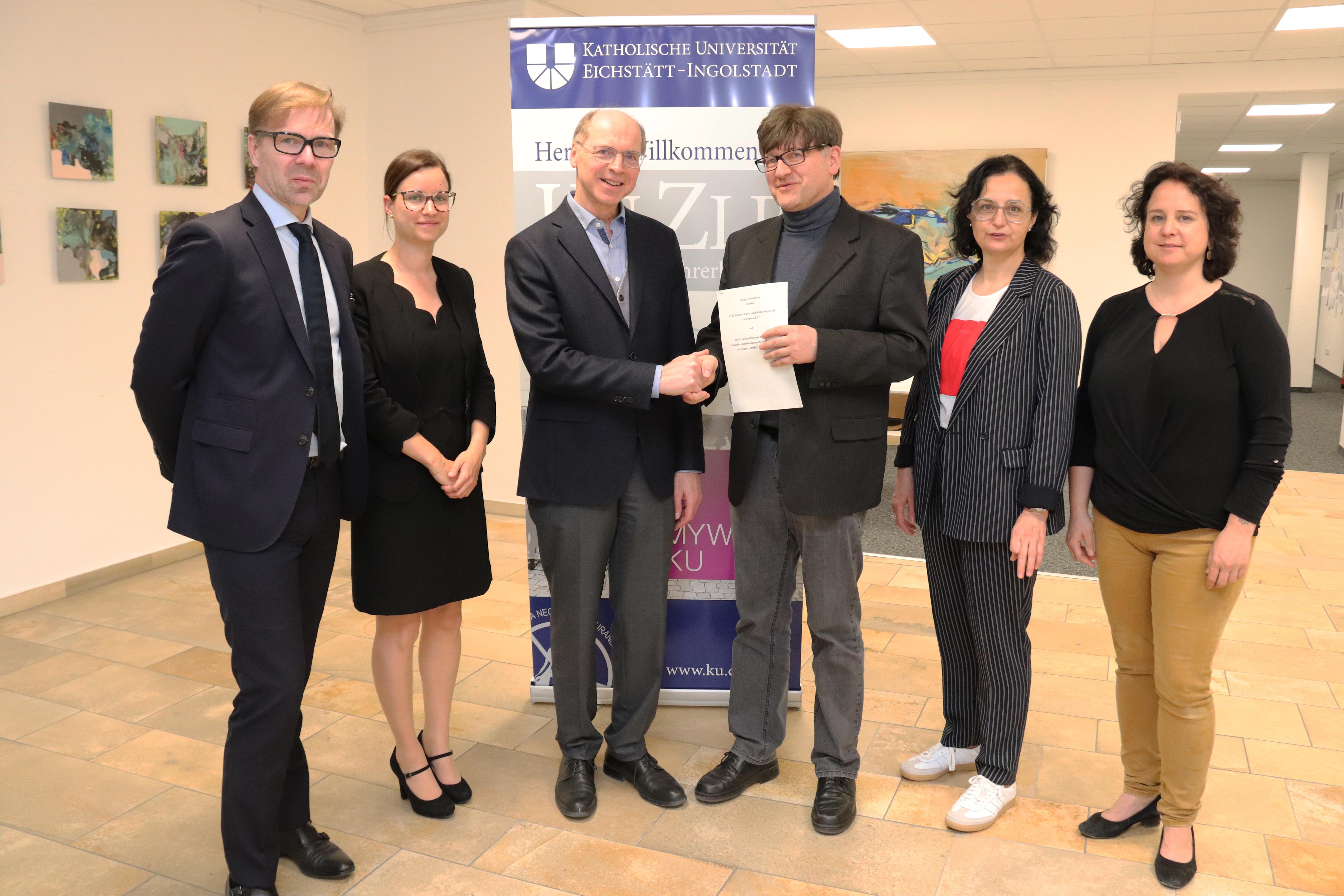 (v.l.) Im Beisein von Prof. Dr. Rainer Wenrich (Leiter des Zentrums für Lehrerbildung an der KU) und ZLB-Geschäftsführerin Laura Weglehner-Motz überreichte KU-Vizepräsident Prof. Dr. Markus Eham an Erich Winter, den Leiter der FOS/BOS Ingolstadt, die zudem von der stellvertretenden Schulleiterin Maria Heller und Kathrin Bührle (Leitung der Hochschulkooperation) repräsentiert wurde. (Foto: Schulte Strathaus/upd)