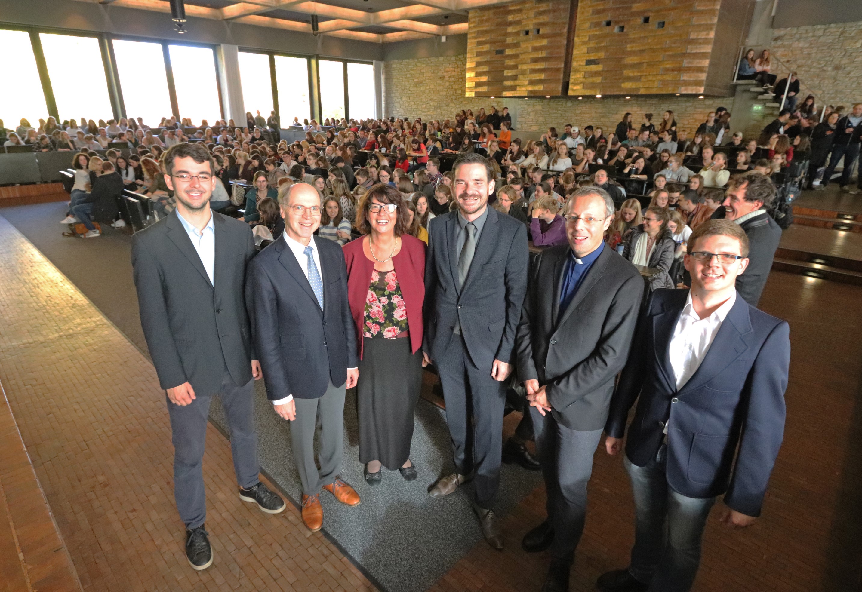 (v.l.) Maximilian Kaiser (Vorsitzender des Studentischen Konvents), KU-Vizepräsident Prof. Dr. Markus Eham, Präsidentin Prof. Dr. Gabriele Gien, Oberbürgermeister Andreas Steppberger, Hochschulpfarrer Pater Stefan Weig und Dr. Benedikt Rodler (Referent für Hochschulpastoral) begrüßten die neuen Studierenden in der Aula der Universität. (Fotos: Schulte Strathaus) (v.l.) Maximilian Kaiser (Vorsitzender des Studentischen Konvents), KU-Vizepräsident Prof. Dr. Markus Eham, Präsidentin Prof. Dr....    »