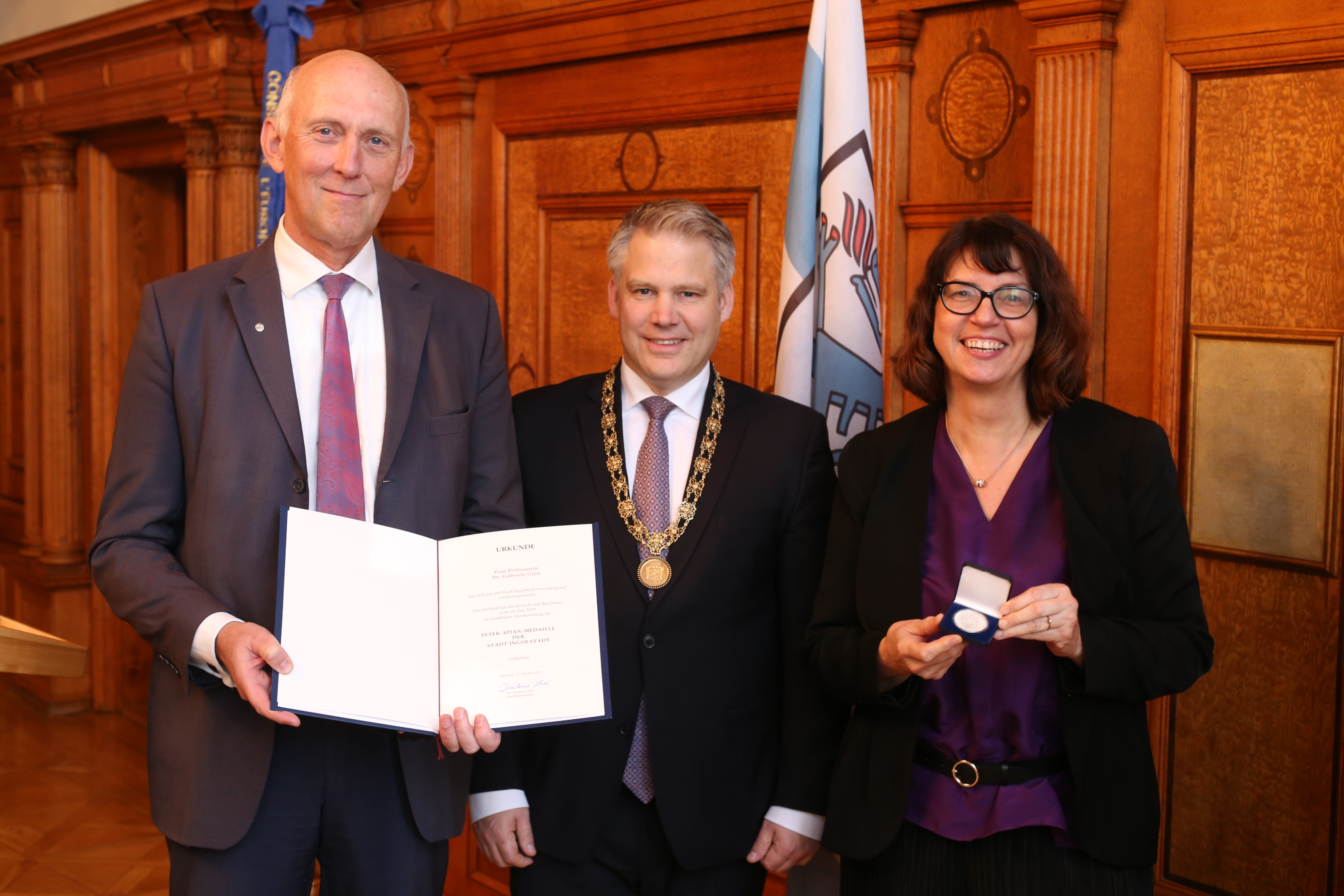 KU-Präsidentin Prof. Dr. Gabriele Gien und THI-Präsident Prof. Dr. Walter Schober (links) sind von Ingolstadts Oberbürgermeister Dr. Christian Lösel mit der Peter-Apian-Medaille ausgezeichnet worden. (Fotos: Klenk/upd)