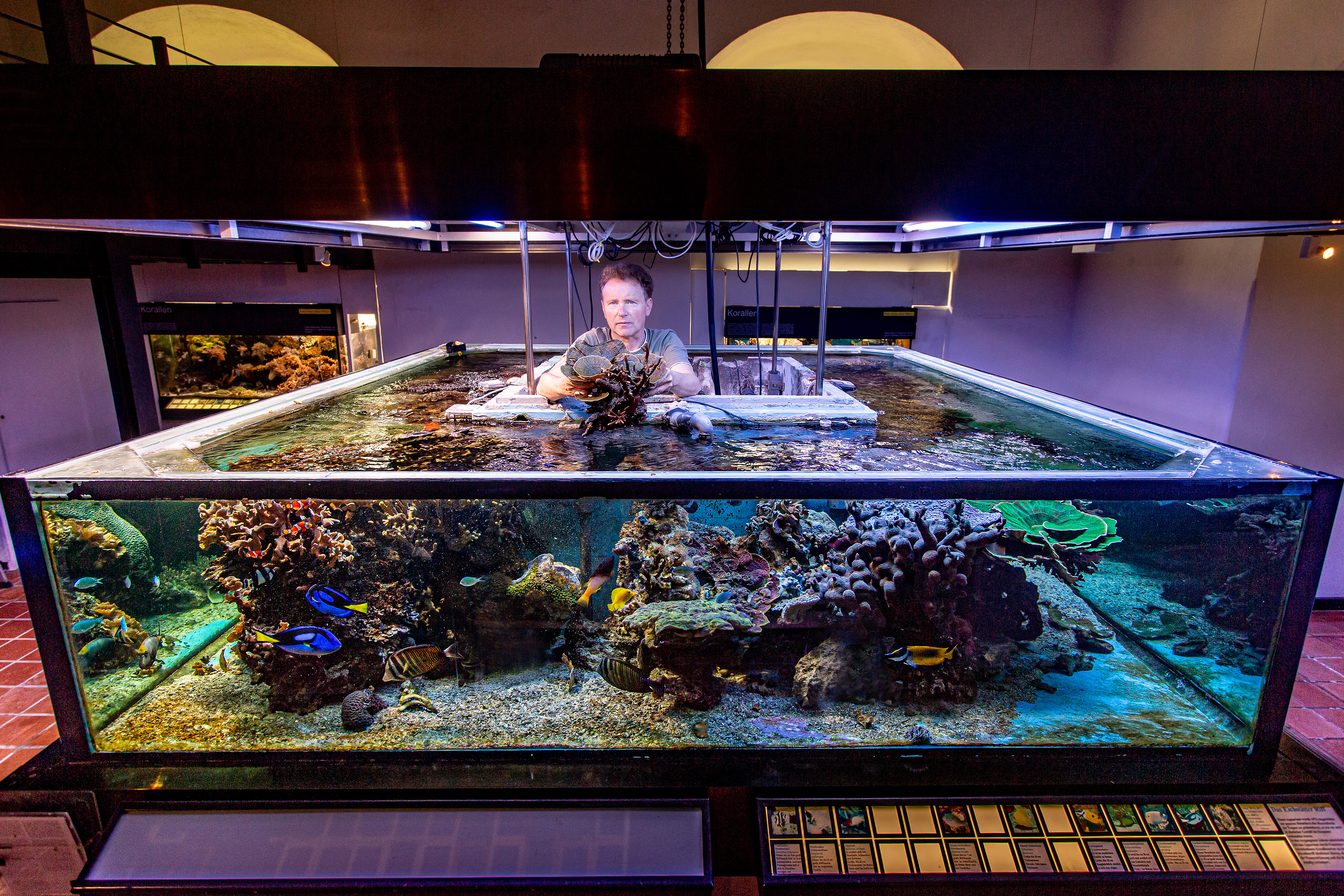 Aquarist Jörg Jahns vom Jura Museum in Eichstätt hebt eine Koralle aus dem großen Salzwasseraquarium. Das größte und artenreichste Riff Bayerns muss evakuiert werden.
