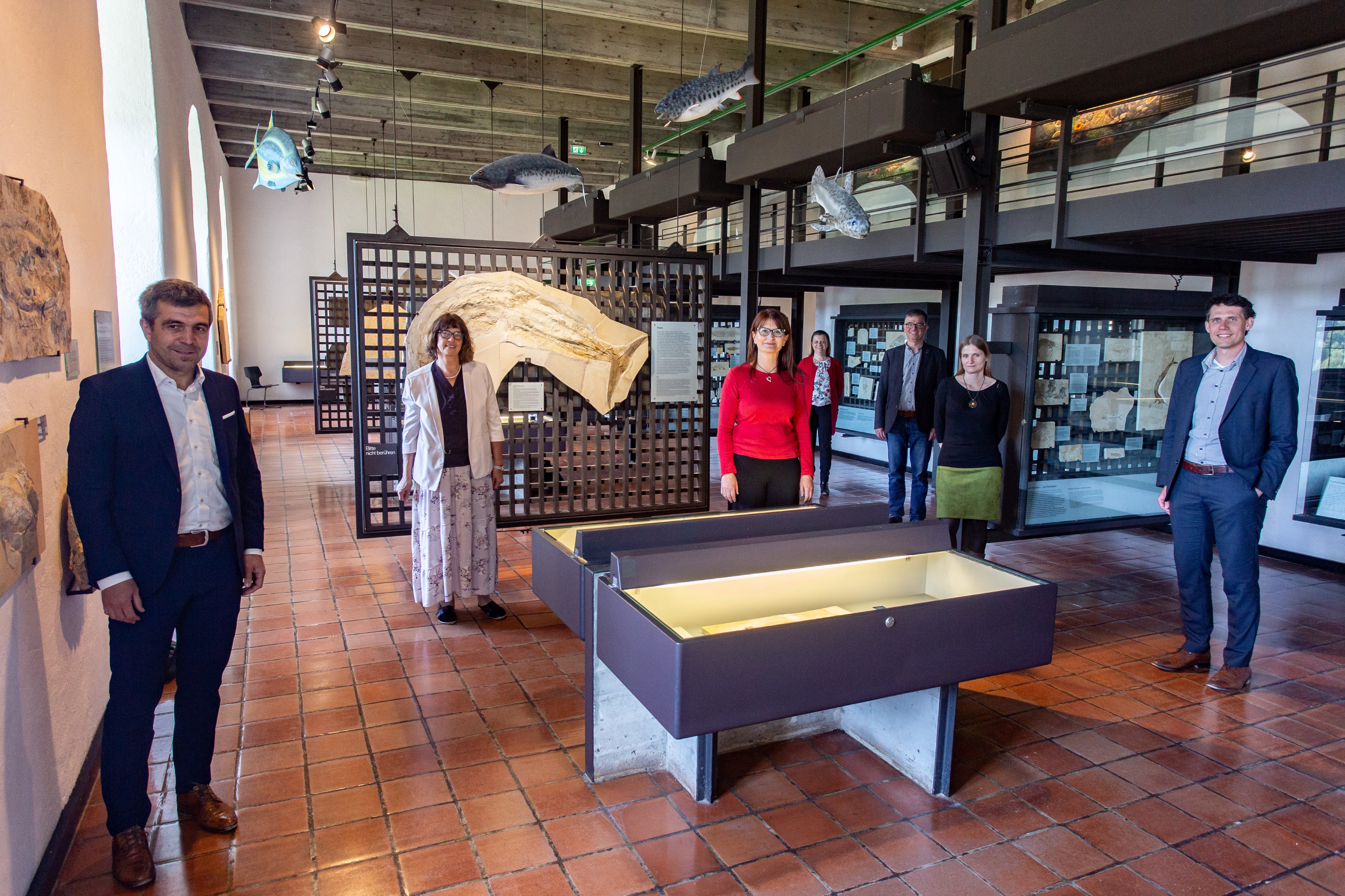 Der neue Eichstätter Landrat Alexander Anetsberger (links) und Eichstätts neuer Oberbürgermeister Josef Grienberger (rechts) tauschen sich im Jura Museum aus mit (v.l.) KU-Präsidentin Prof. Dr. Gabriele Gien, Museumsleiterin PD Dr. Christina Ifrim, Projektreferentin Claudia Reng, Christoph Würflein (Geschäftsführer Naturpark Altmühltal) und Dr. Stephanie Armer (Geschäftsführerin des Jura Museums). (Foto: Klenk/upd)