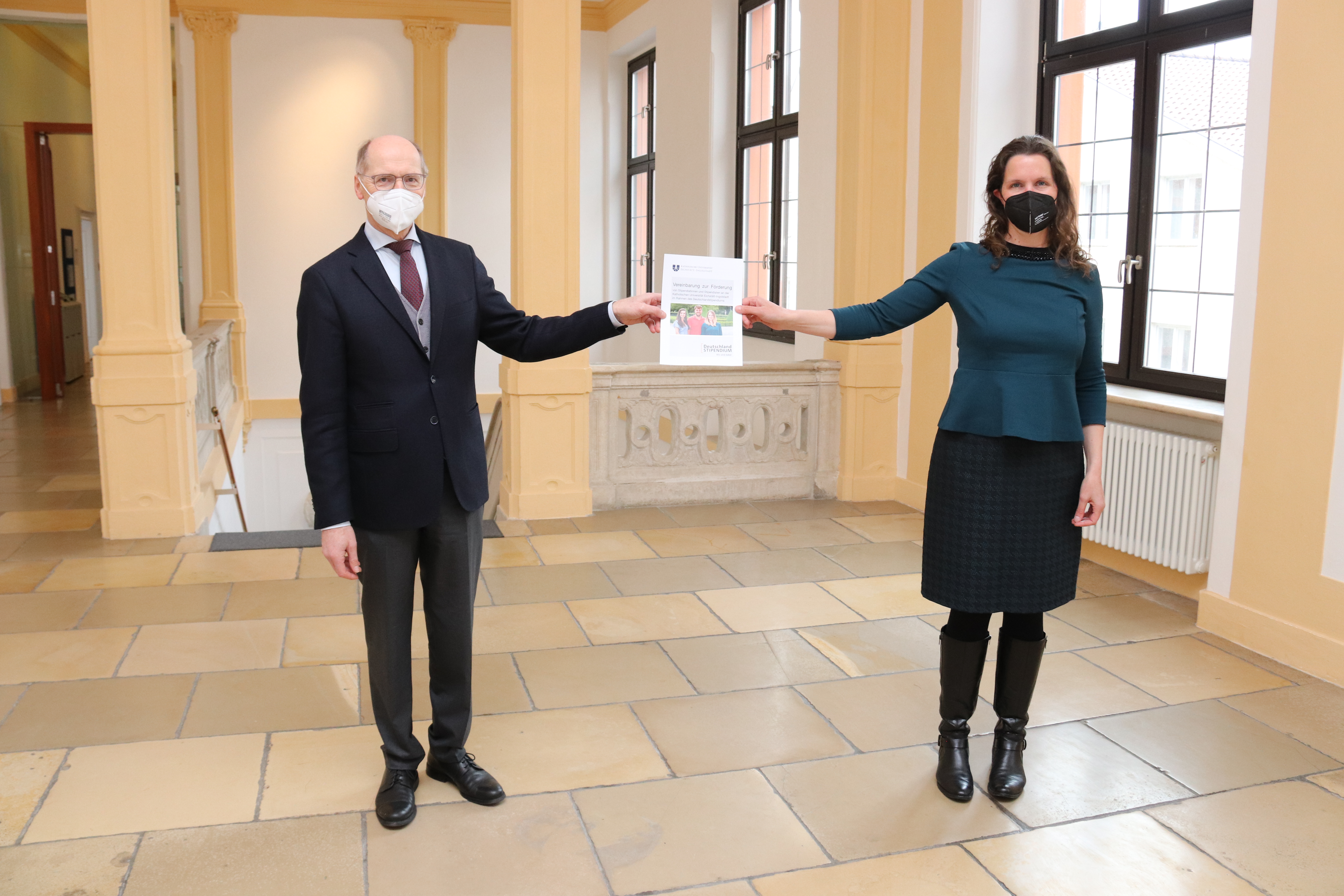 Die Förderpatenschaft für ein Deutschlandstipendium an der Katholischen Universität Eichstätt-Ingolstadt (KU) in Höhe von 1800 Euro übernimmt für ein Jahr die Eichstätter Universitätsstiftung. Im Namen des Stiftungsvorstan-des überreichte Christine Hüttinger, stellvertretende Finanzdirektorin des Bistums Eichstätt, nun eine entsprechende Fördervereinbarung an Prof. Dr. Markus Eham, Vizepräsident für Studium und Lehre der KU. Eham dankte für das Engagement der Universitätsstiftung, deren Förderung vom Bund verdoppelt wird. Denn sobald Stiftungen, Förderer oder Unternehmen ein monatliches Stipendium in Höhe von 150 Euro finanzieren, stockt der Bund diese Summe auf 300 Euro auf. Staat und Gesellschaft können durch das Deutschlandstipendium somit gemeinsam begabte, leistungsstarke und en-gagierte junge Menschen auf ihrem Bildungsweg unterstützen. Diese Form der Förderung wird bundesweit seit mehreren Jahren an Studierende mit besonderen Begabungen und herausragenden Leistungen vergeben.