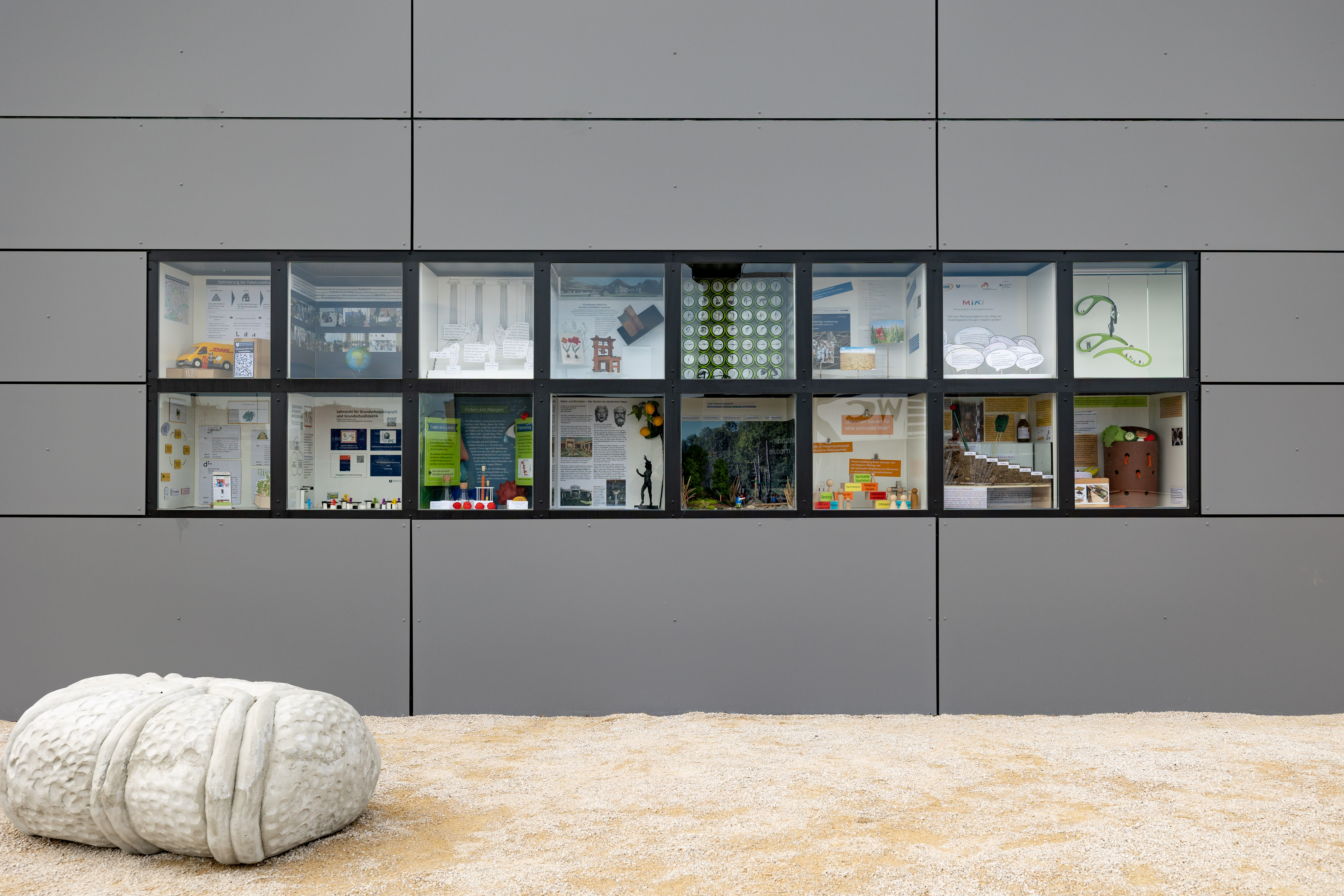 Neben einer Aktionsbühne sind im Pavillon der KU darin auch 40 Vitrinen integriert, in denen die Fächer der Universität ihren Bezug zu Fragen von Nachhaltigkeit und Natur vorstellen.