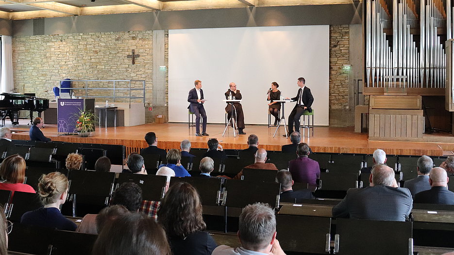 Verantwortung und Beteiligung in der Kirche standen im Mittelpunkt der dreigeteilten, gemeinsamen Antrittsvorlesungen von (v.r.) Prof. Dr. Benjamin Dahlke, Prof. Dr. Katharina Karl und Prof. Dr. Rafael Rieger OFM, hier im Gespräch mit Moderator Dr. Christian Klenk.