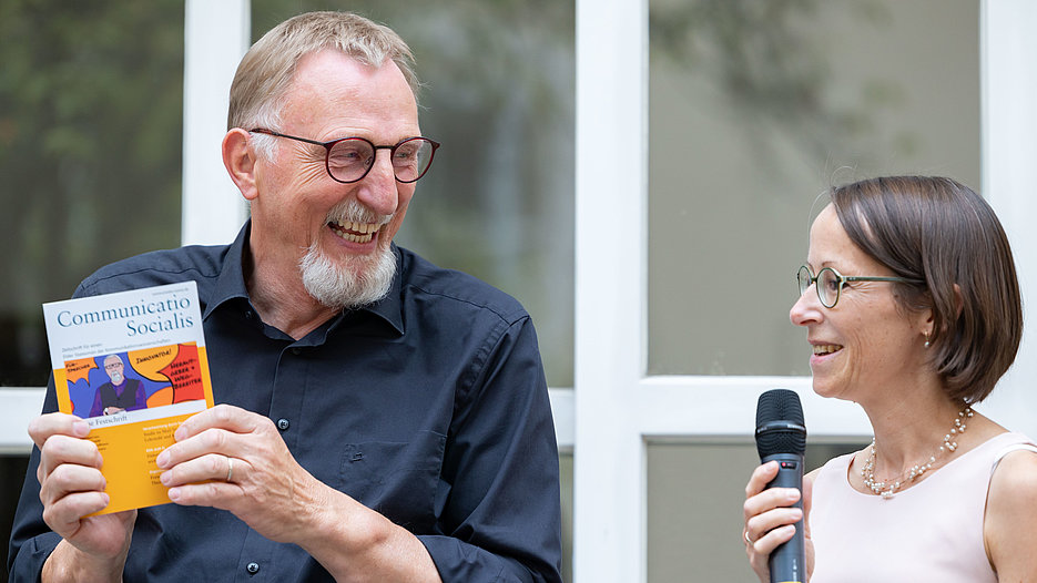 Klaus-Dieter Altmeppen erhält anlässlich seiner Verabschiedung eine Sonderausgabe der von ihm mitherausgegebenen Fachzeitschrift „Communicatio Socialis“, die den Titel „Keine Festschrift“ trägt – überreicht von Annika Franzetti, Mitarbeiterin des Studiengangs (Fotos: Christian Klenk)