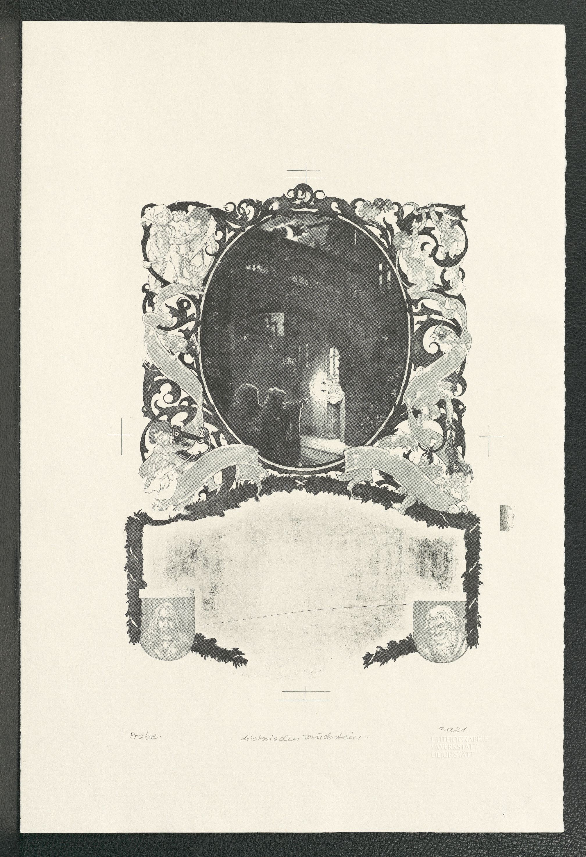 Lithographie; ca. 29 x 21 cm (Bild) bzw. 47,7 x 32 cm (Blatt). - Angabe von Zusatz und Druckjahr mit Bleistift. - Verlagsangabe als Prägedruck (fehlerhaft). - MIT DIGITALAUFNAHME